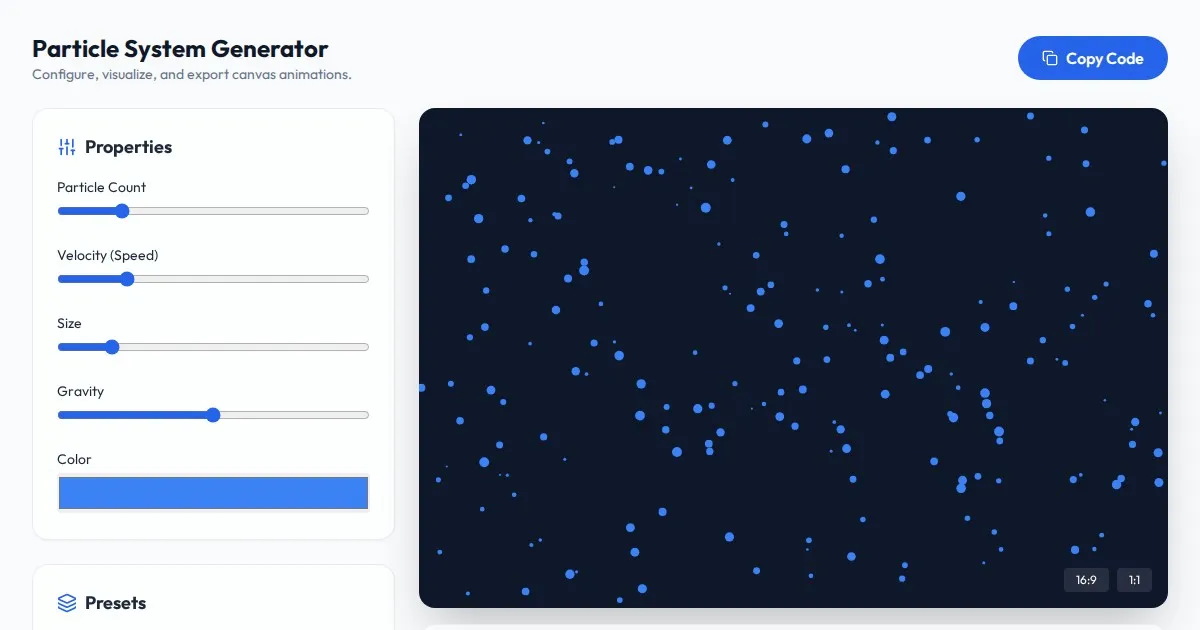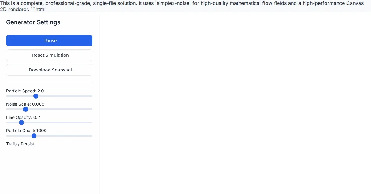 Generate smooth, abstract, and interactive Perlin noise flow field particle canvas animations. Customize particle speed, density, and colors in real-time.