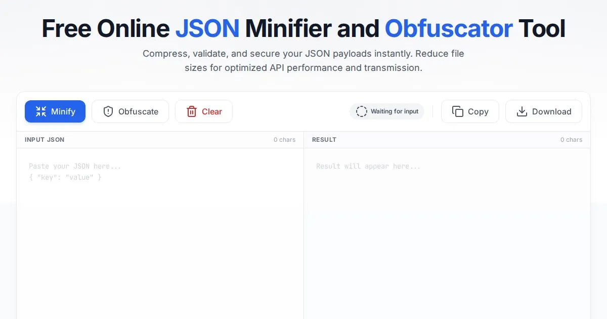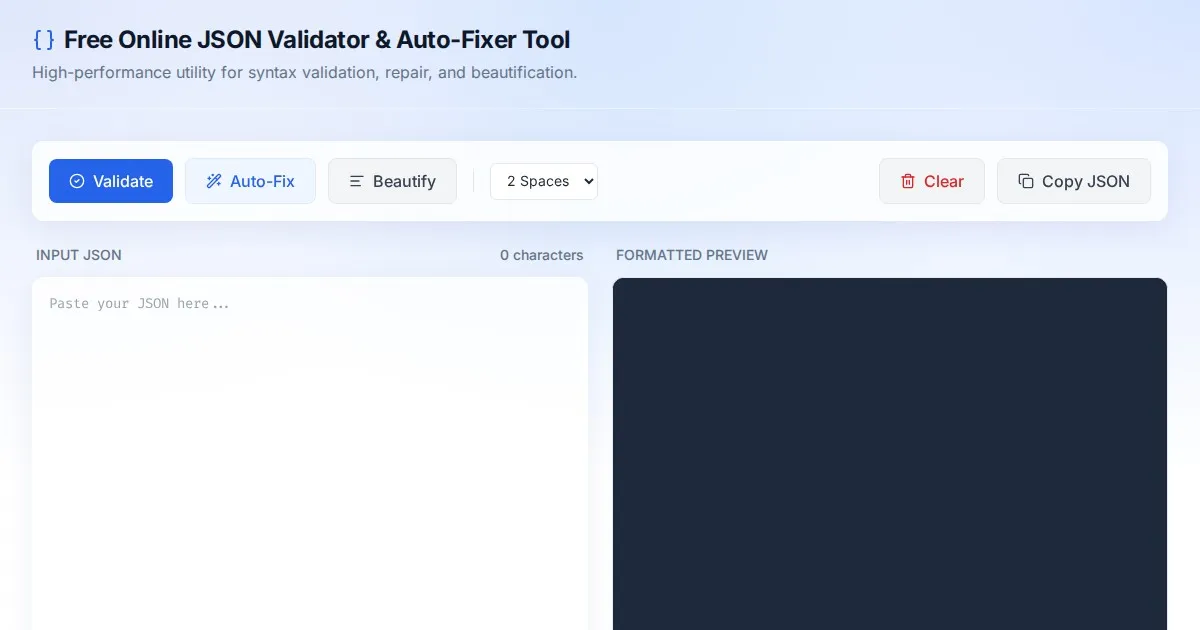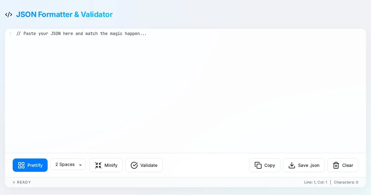 Use this free online tool to validate, format, prettify, and minify JSON code instantly. Perfect for developers debugging APIs and parsing data structures.