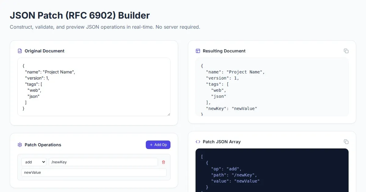 Effortlessly build, test, and validate JSON Patch operations (RFC 6902) online. Generate compliant diffs and preview changes instantly in a simple browser tool.
