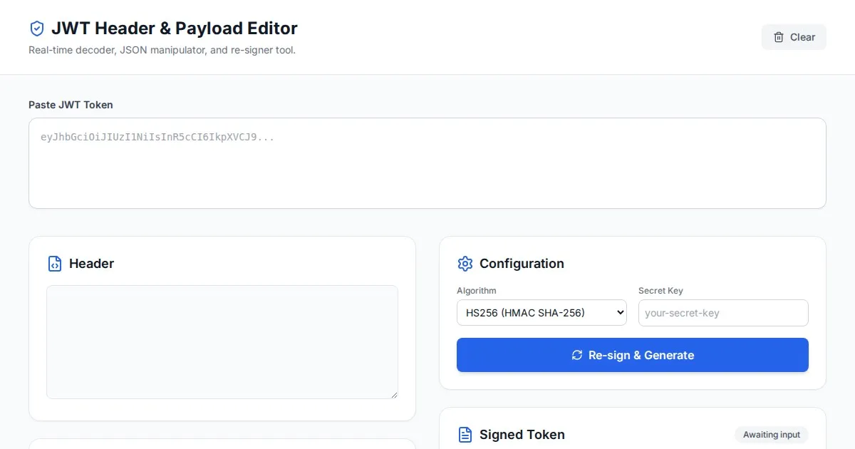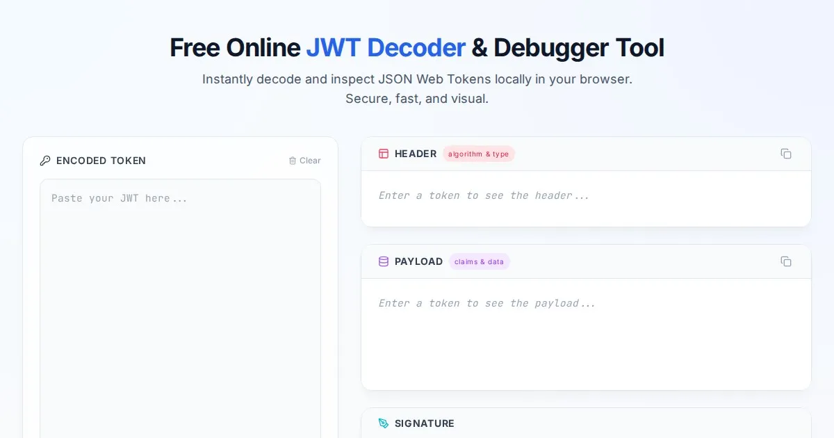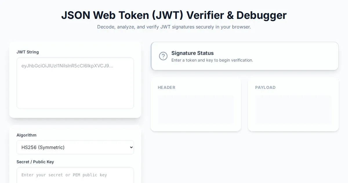 Instantly verify and debug your JSON Web Tokens (JWT). Check symmetric (HS256) versus asymmetric (RS256/ES256) signatures securely in your browser. Free and private.