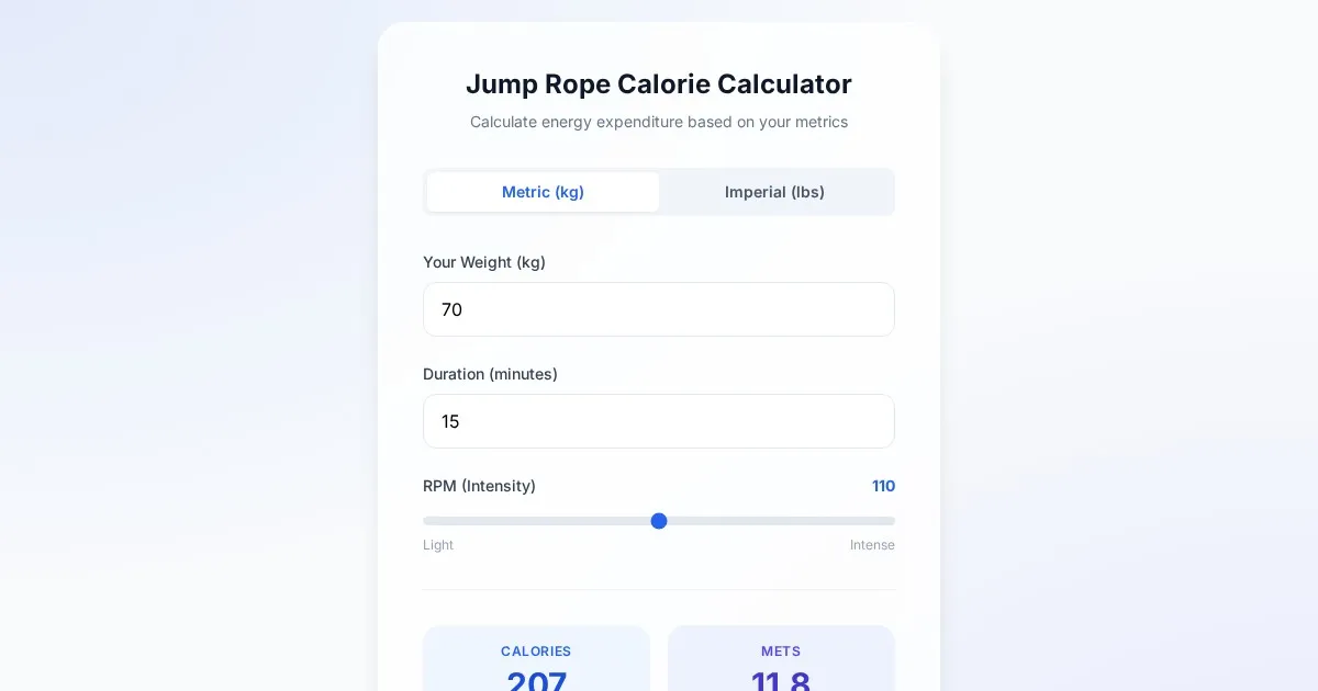 Calculate how many calories you burn jumping rope. Enter your body weight, session duration, and intensity (RPM) for an accurate fitness expenditure estimate.