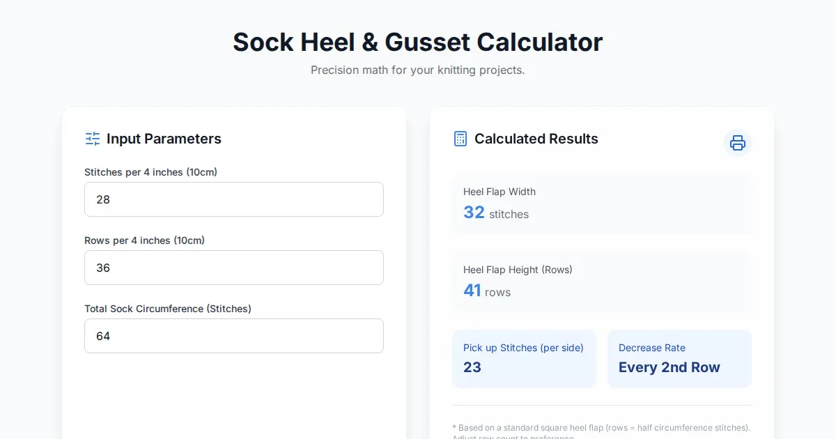 Use this free knitting calculator to determine sock heel flap row counts and gusset decrease math. Simple, precise, and fast calculations for your socks.