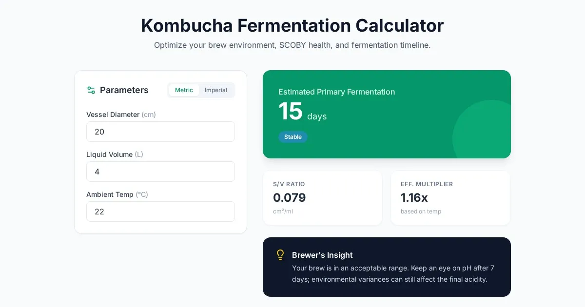 Accurately estimate kombucha fermentation times using our free SCOBY surface area calculator. Optimize your home brew vessel dimensions and temperature today.