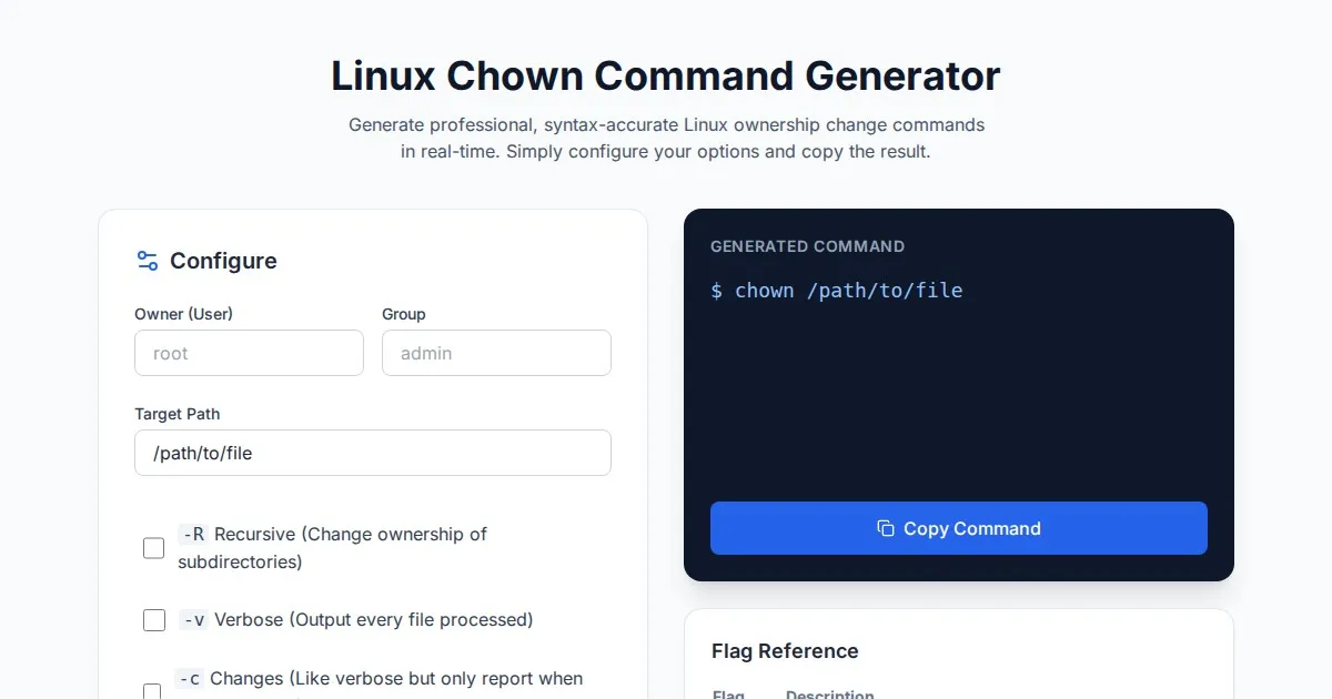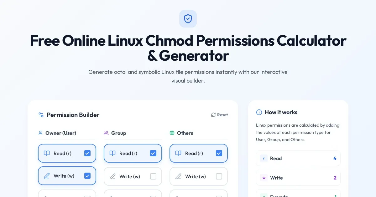 Calculate Linux/Unix file permissions instantly. Generate chmod numeric and symbolic commands easily with our free, web-based terminal permission tool.