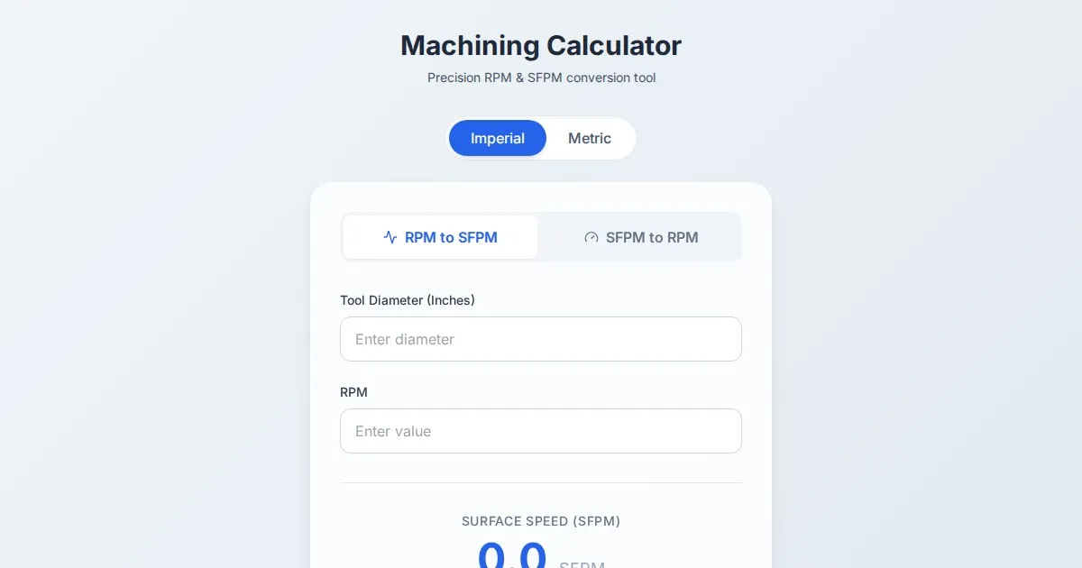 Instantly calculate Surface Feet Per Minute (SFPM) from RPM and cutting tool diameter. A precise, free online tool for CNC machinists and manufacturing engineers.