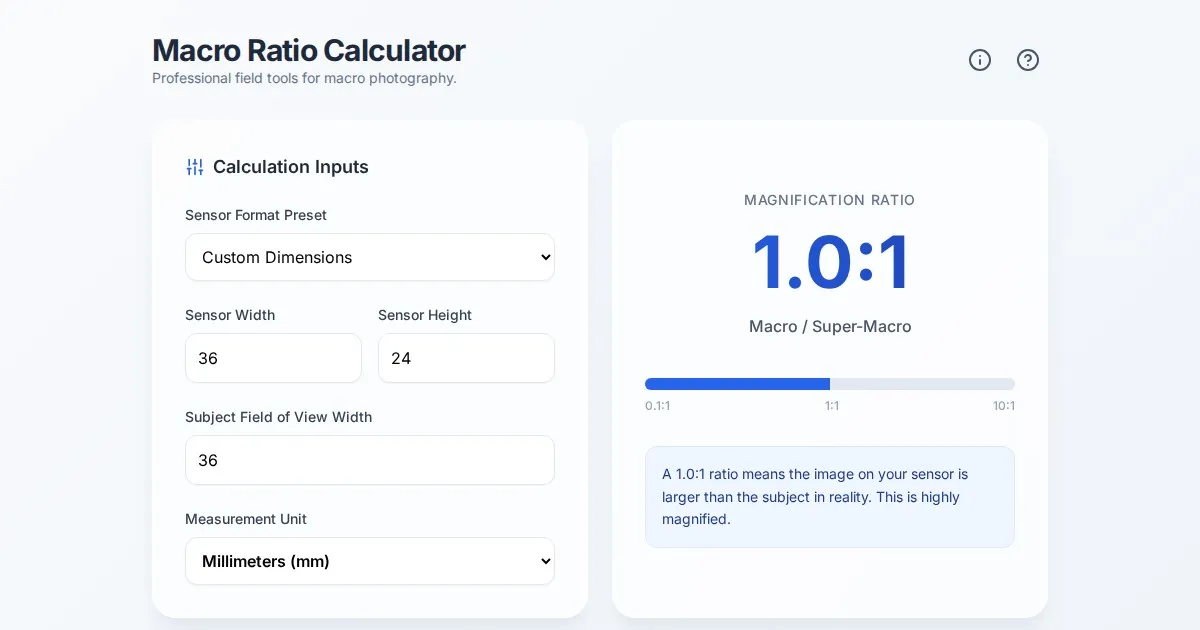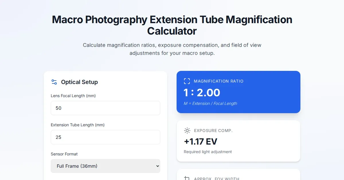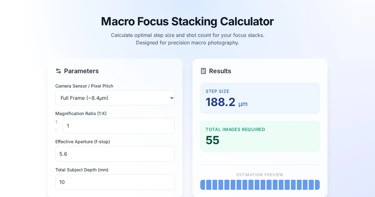 Calculate precise focus stacking step sizes for macro photography. Improve depth of field and image sharpness with this free, easy-to-use browser tool.