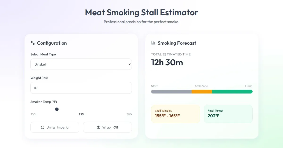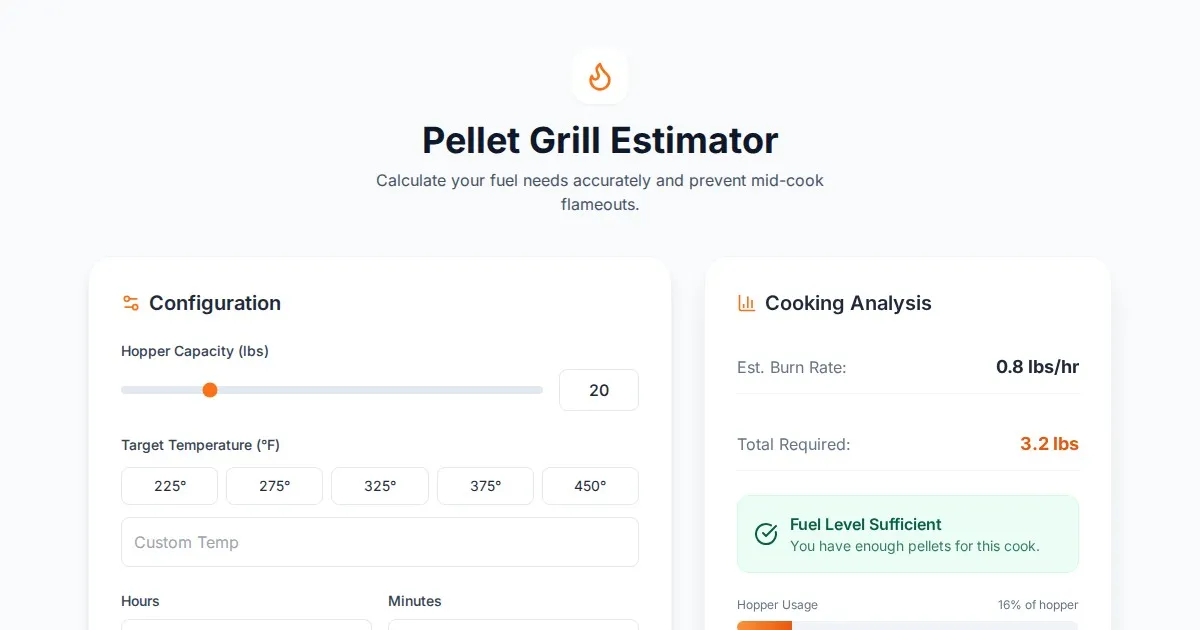Accurately estimate your BBQ wood pellet usage. Calculate burn rate, total fuel consumption, and required pellet weight for brisket, pork, and rib smoking sessions.