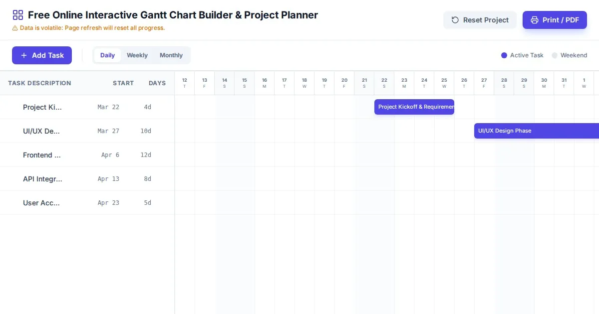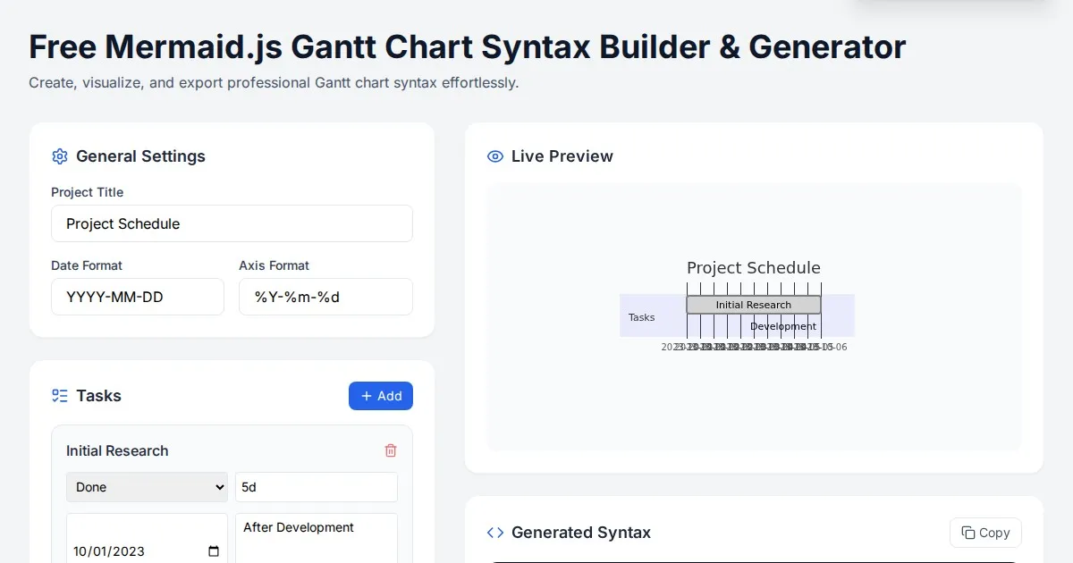 Create professional project schedules with our free Mermaid.js Gantt chart builder. Easily generate, preview, and export clean syntax for Markdown documentation.