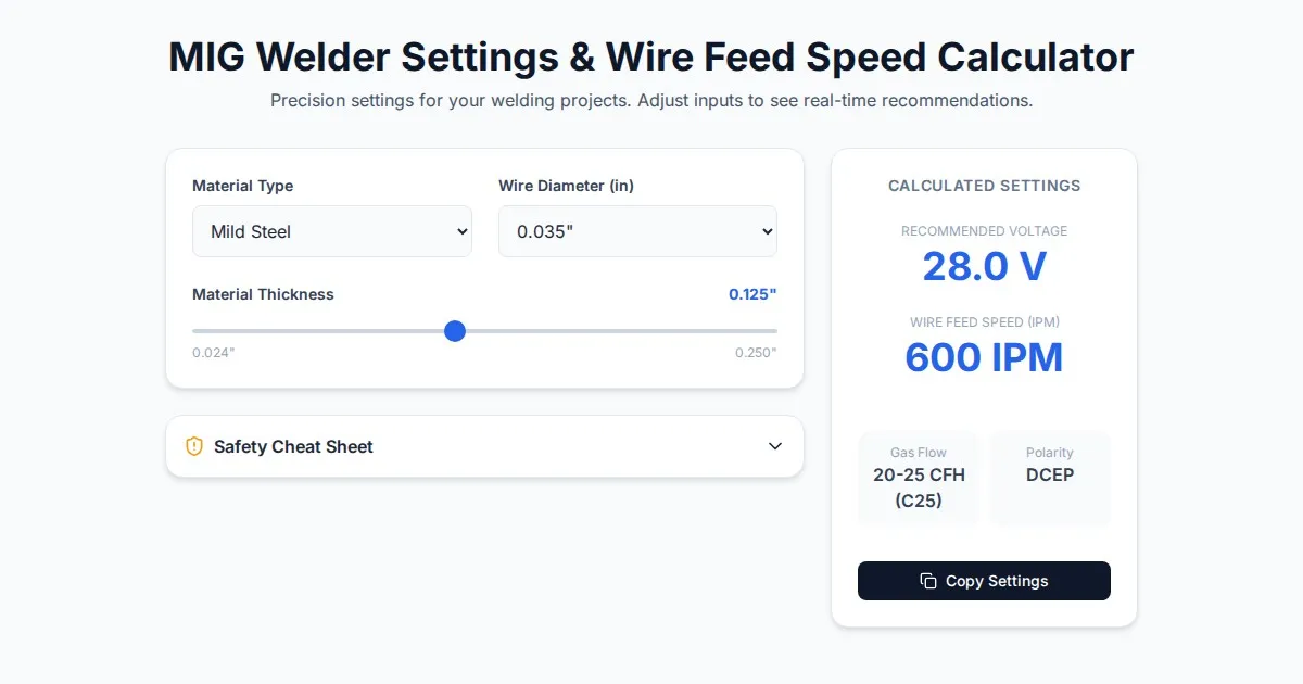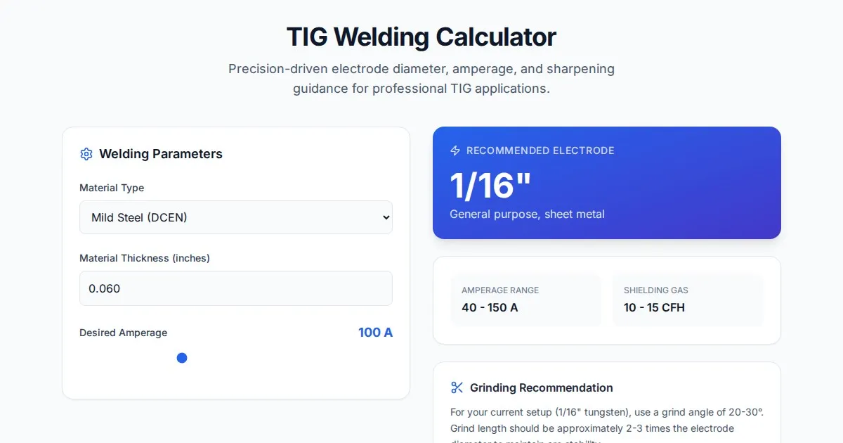 Use this free online TIG welding tool to quickly calculate the recommended Tungsten electrode diameter, amperage range, and sharpening angles for your welds.