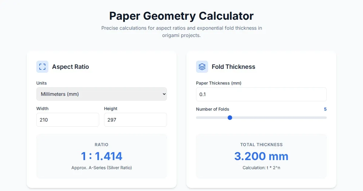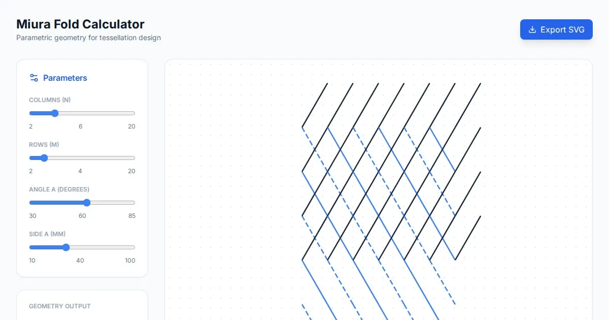 Calculate exact dimensions, grid ratios, and crease patterns for Miura-ori origami tessellations with this free, browser-based engineering design tool.