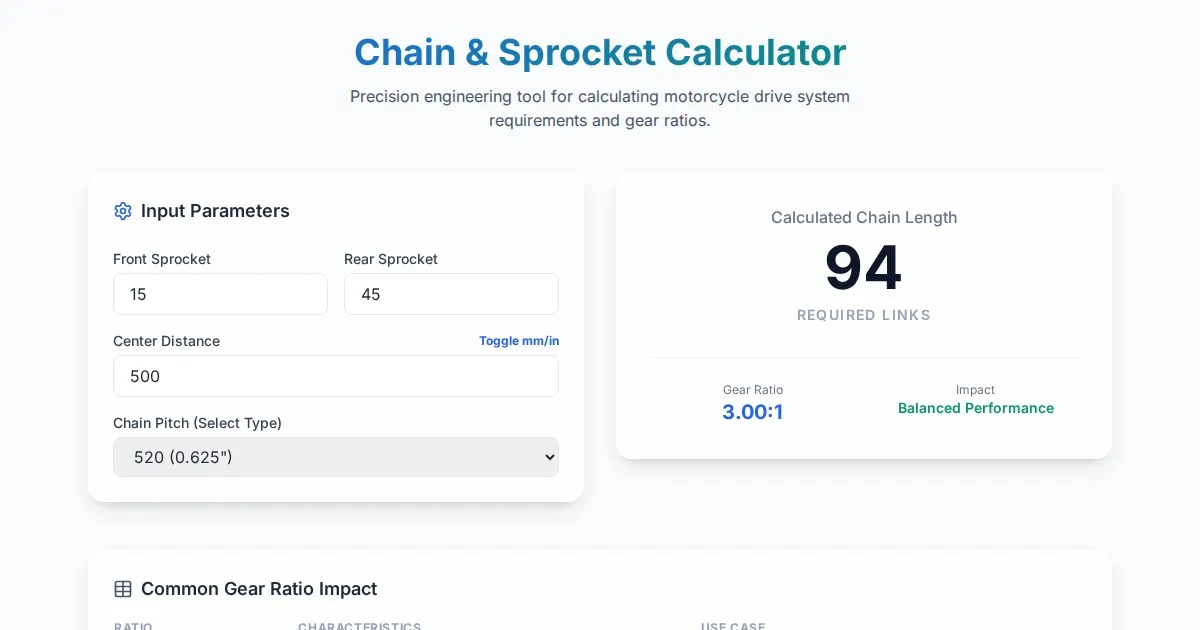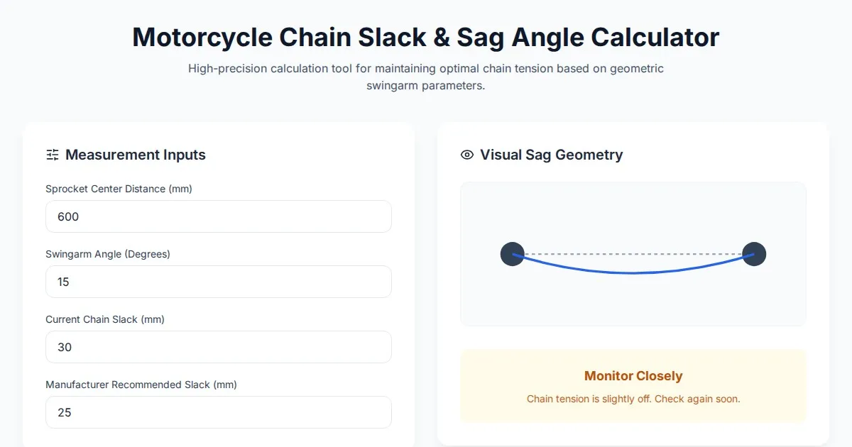 Calculate motorcycle chain slack and sag with our easy-to-use tool. Determine precise chain tension based on swingarm angle for safer, smoother riding.