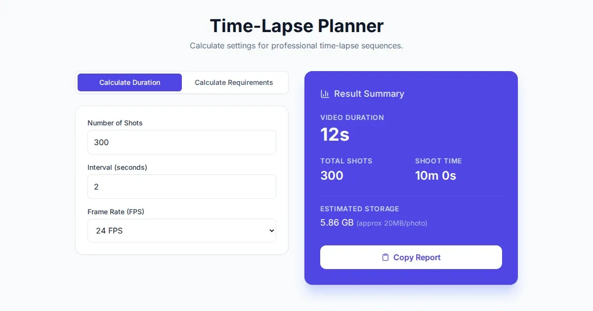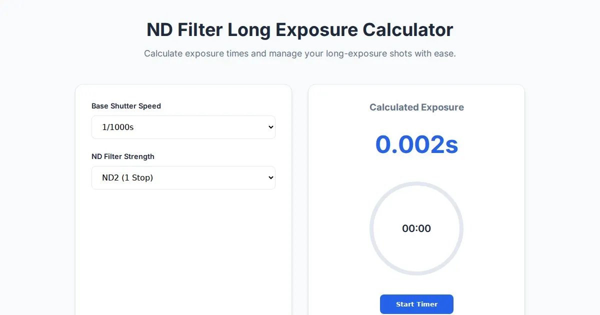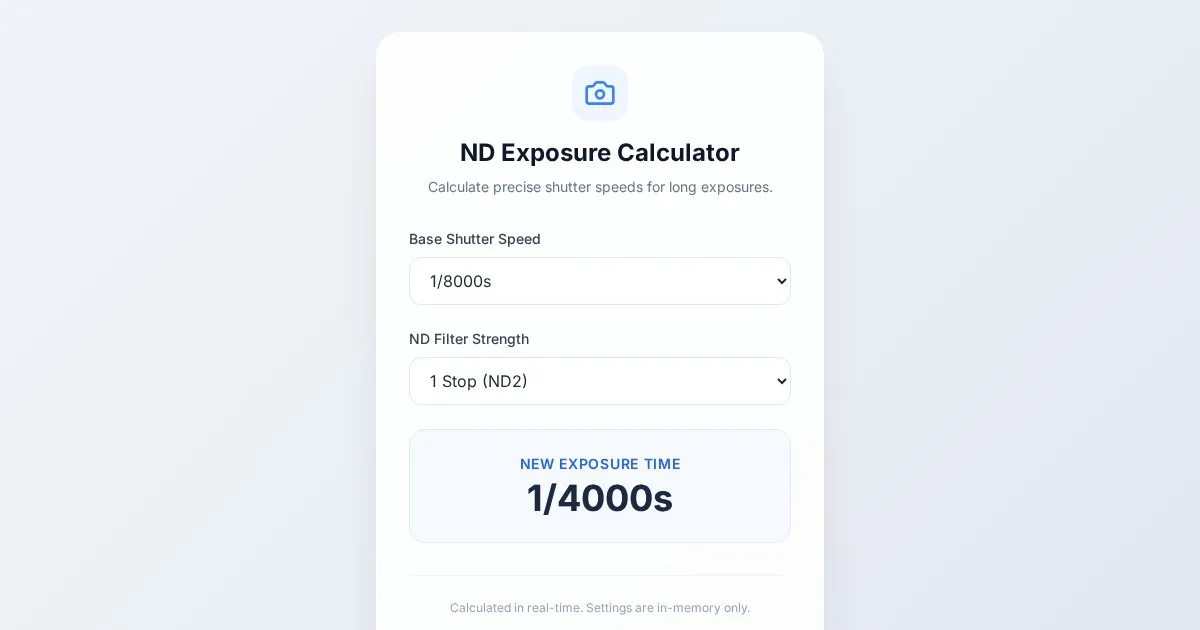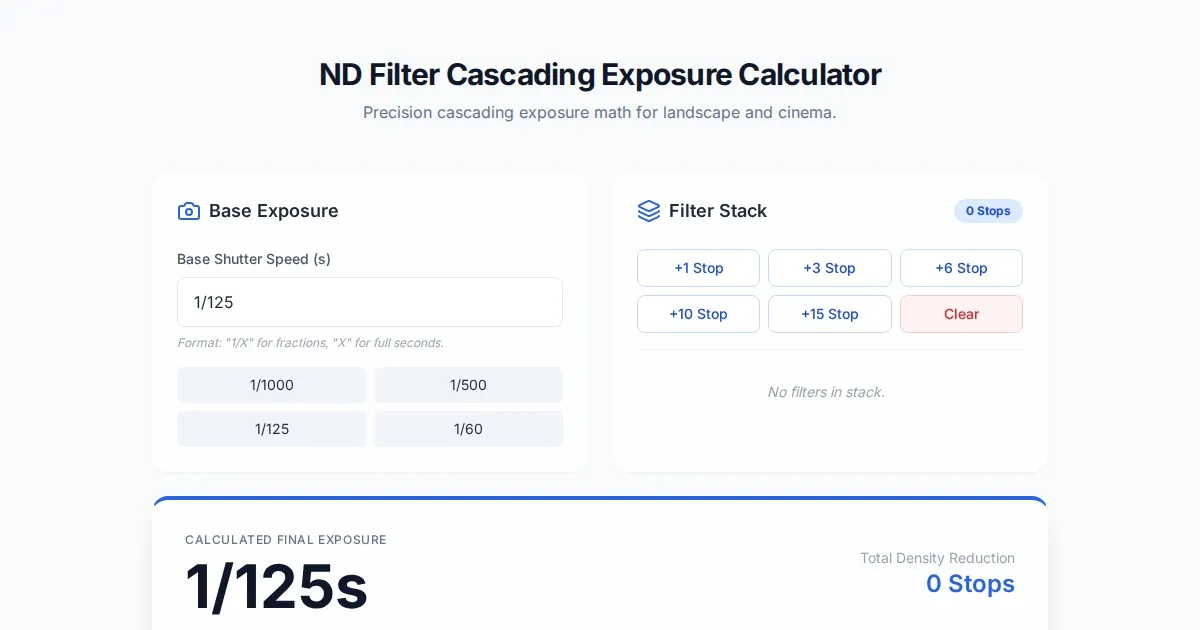 Calculate combined exposure times for stacked Neutral Density filters effortlessly. Perfect for long exposure photography and cinematic videography timing.