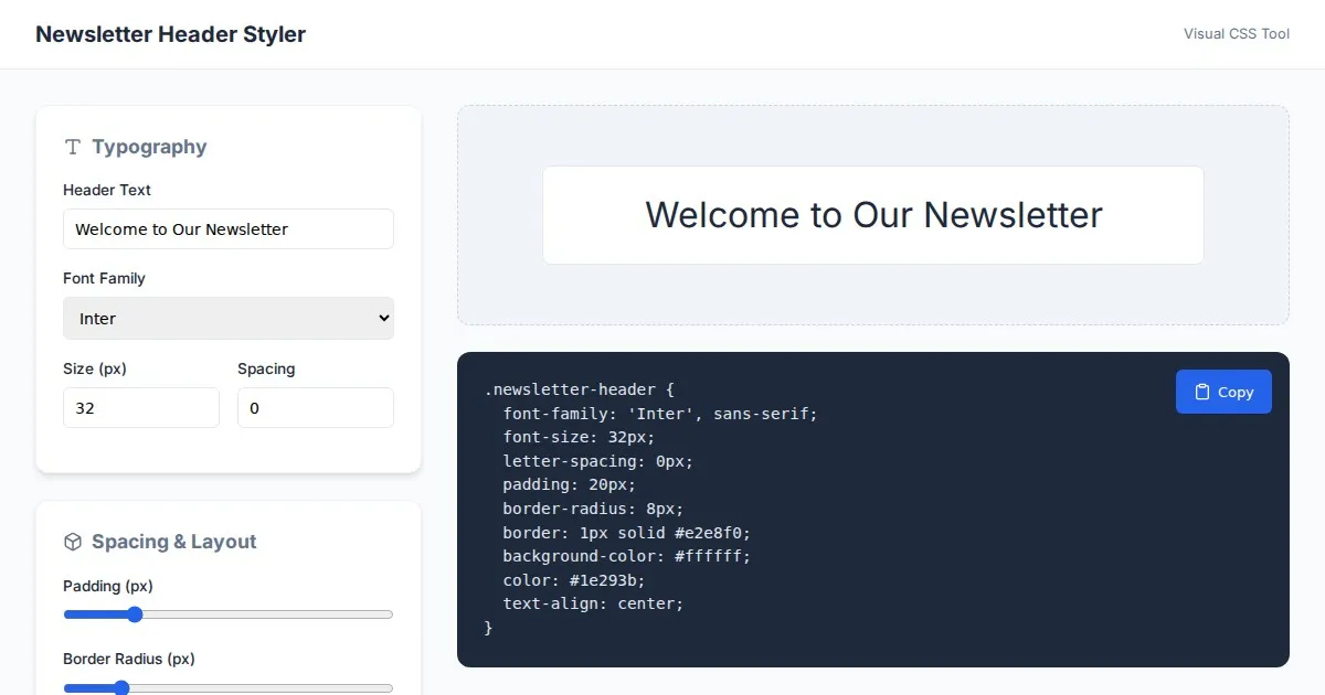 Create custom CSS styles for your newsletter headers with this free, browser-based visual editor. Design, preview, and generate clean CSS code for professional email.