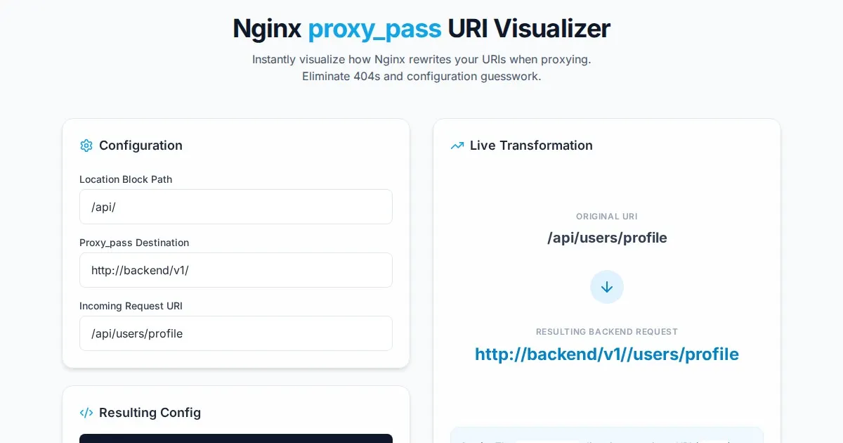 Debug Nginx proxy_pass URI rewrites with this free visual tool. Easily determine the resulting request URI for location blocks with and without trailing slashes.