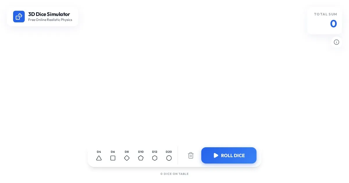 Use our free online 3D dice roller to generate random rolls for tabletop games and RPGs. Realistic physics-based dice simulator with no setup required.