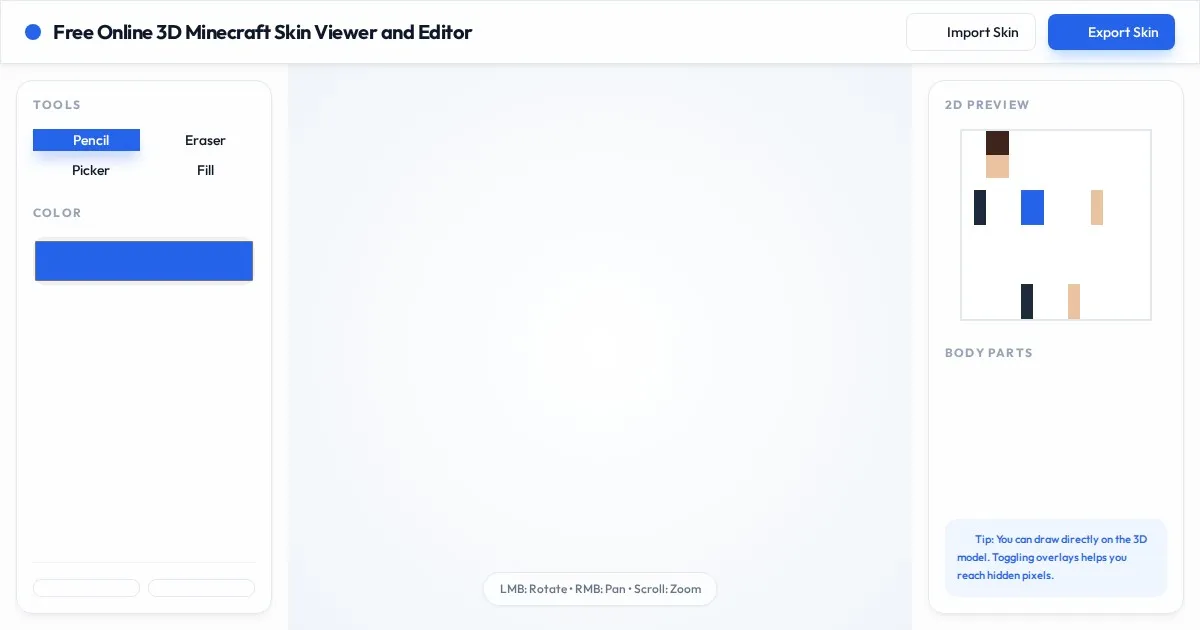 Use our free online 3D Minecraft skin viewer and editor to customize, preview, and download your unique Minecraft skins directly in your browser. No installs.