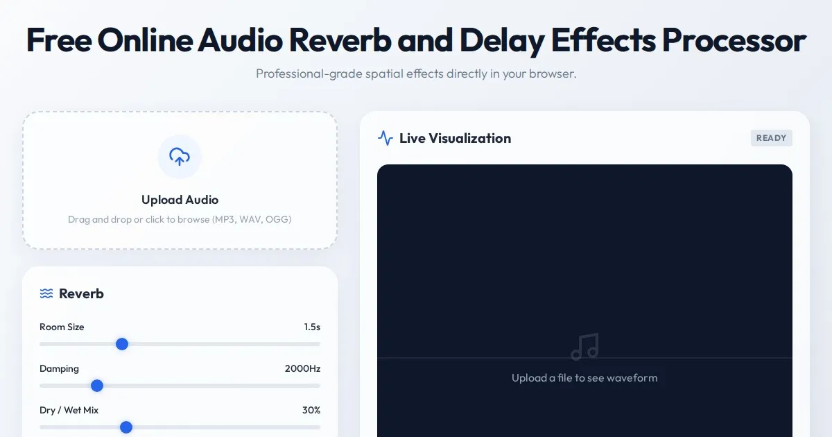 Apply studio-quality reverb and delay audio effects to your files instantly. This free, browser-based audio processor requires no software installation.
