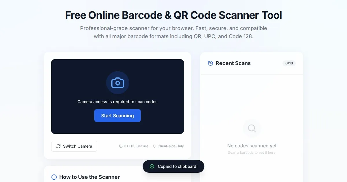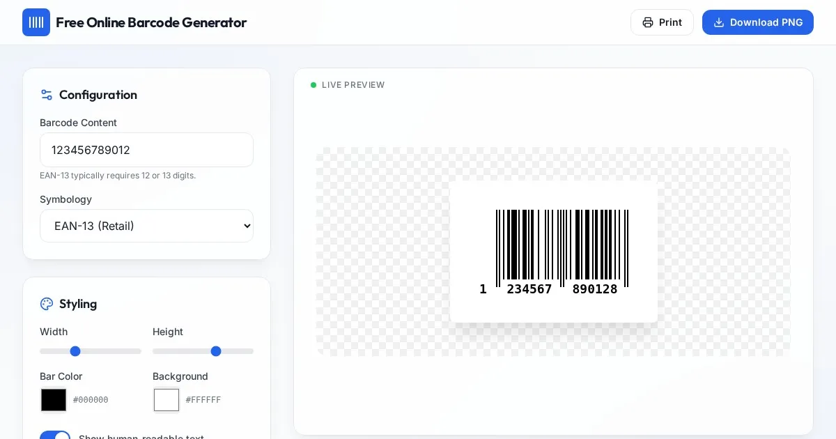 Generate high-quality professional barcodes online for free. Supports UPC-A, EAN-13, Code 128, and more. Fast, secure, and works in your browser without storage.