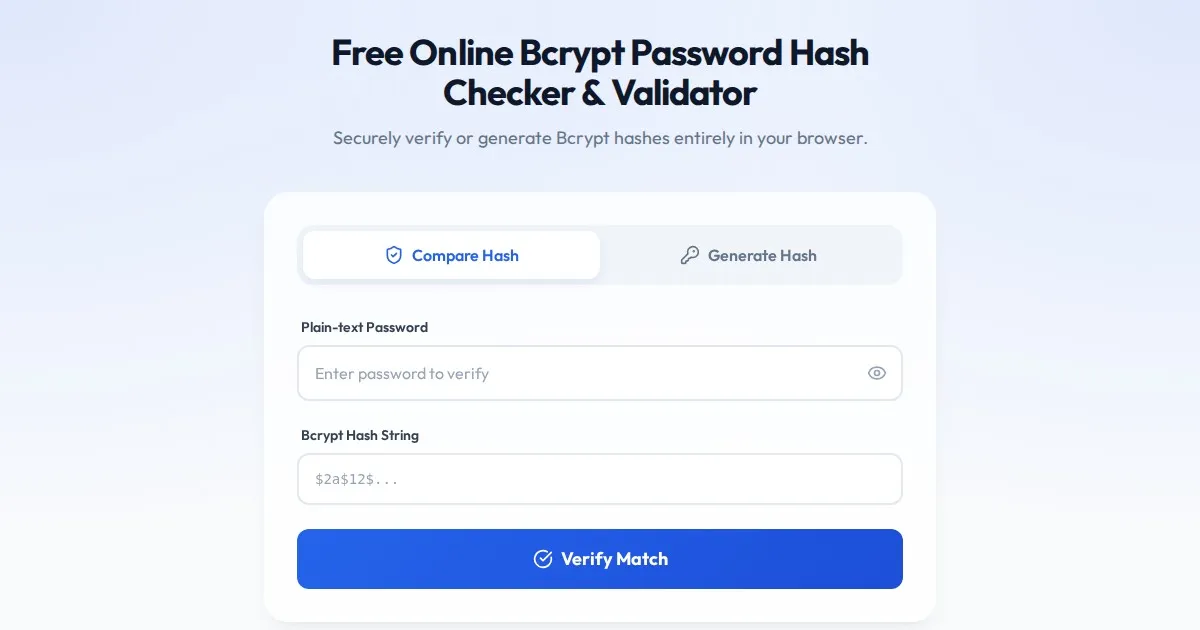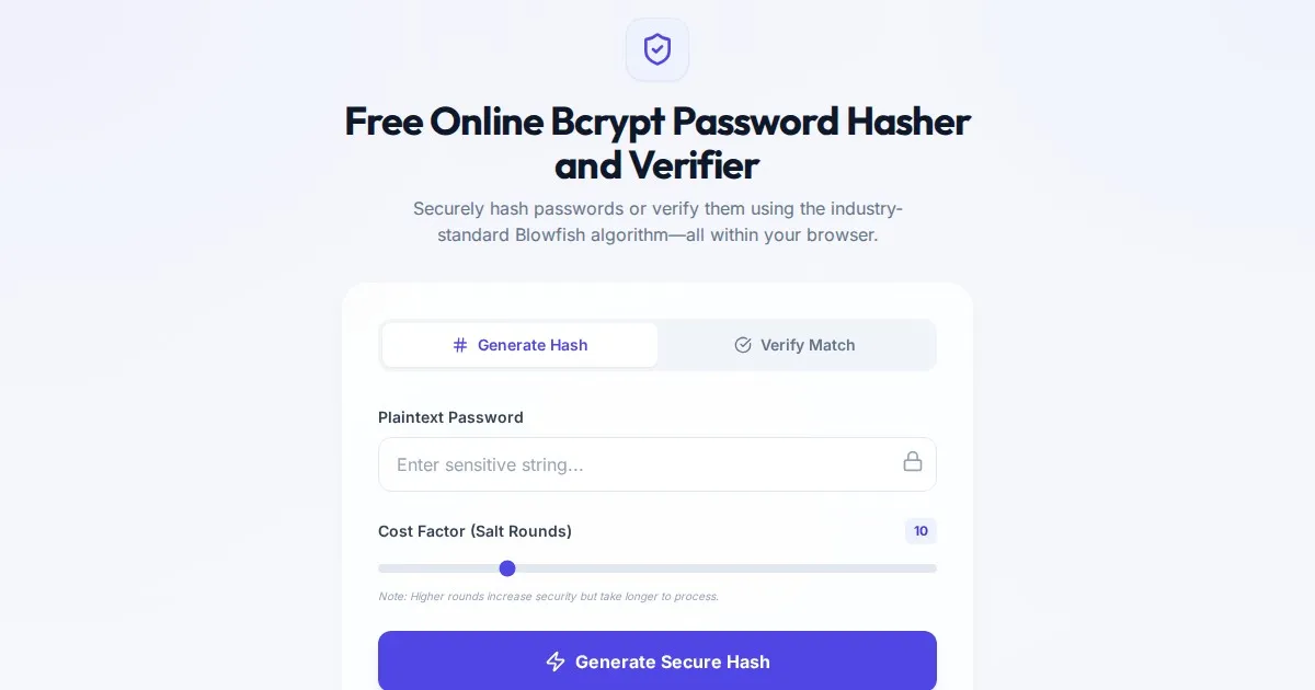 Securely generate and verify Bcrypt password hashes directly in your browser. A free, client-side utility for developers to hash strings and test password matching.