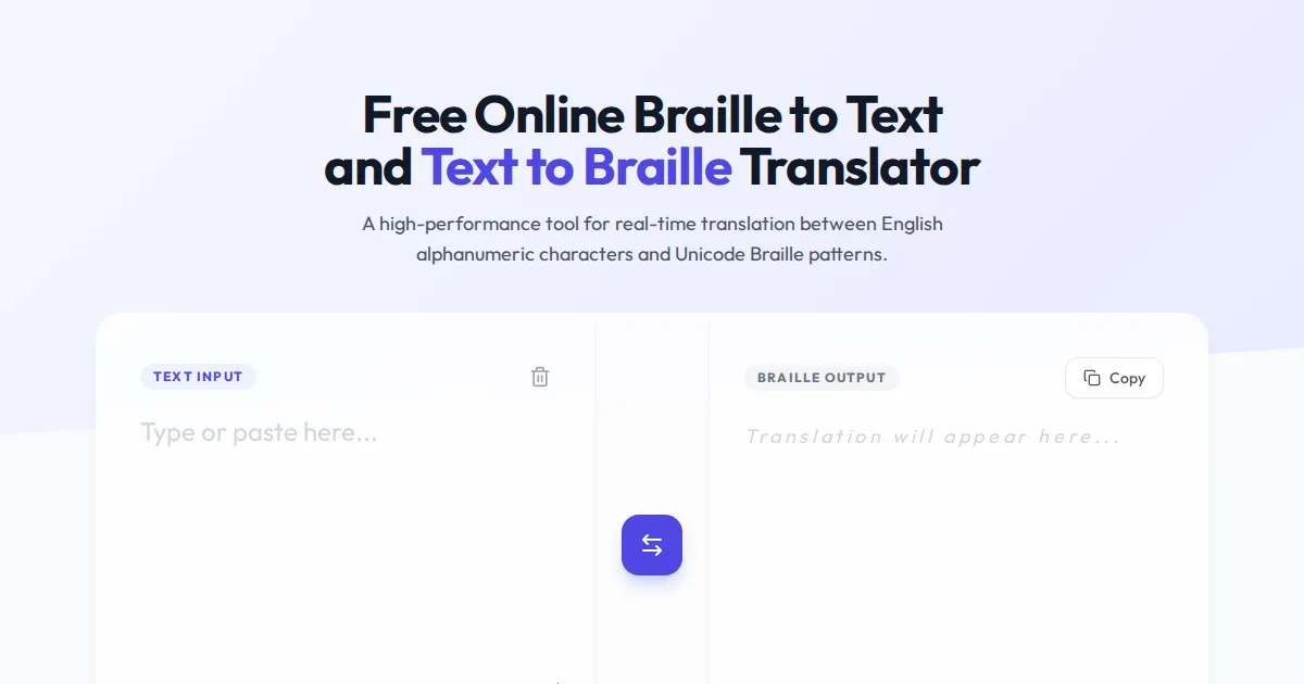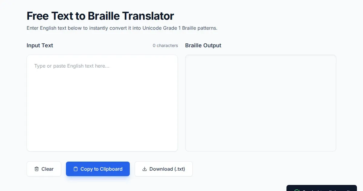 Convert plain text to Braille symbols and translate Braille Unicode back to readable text instantly with this free, accessible online Braille translator tool.