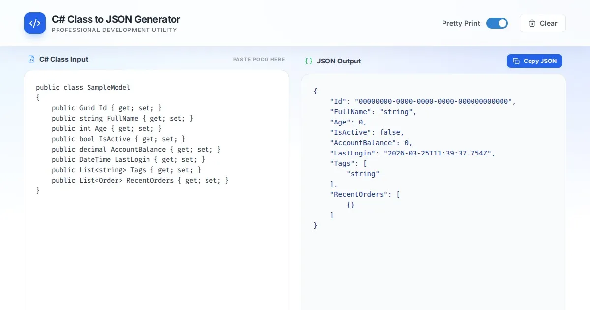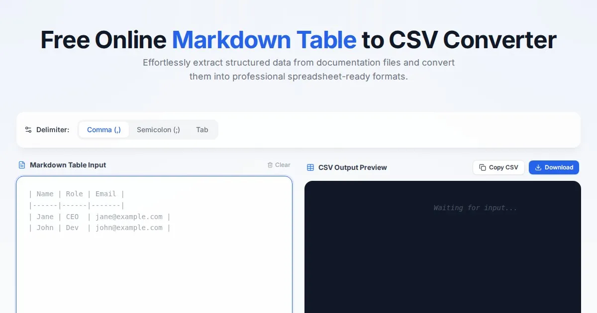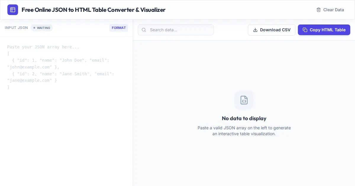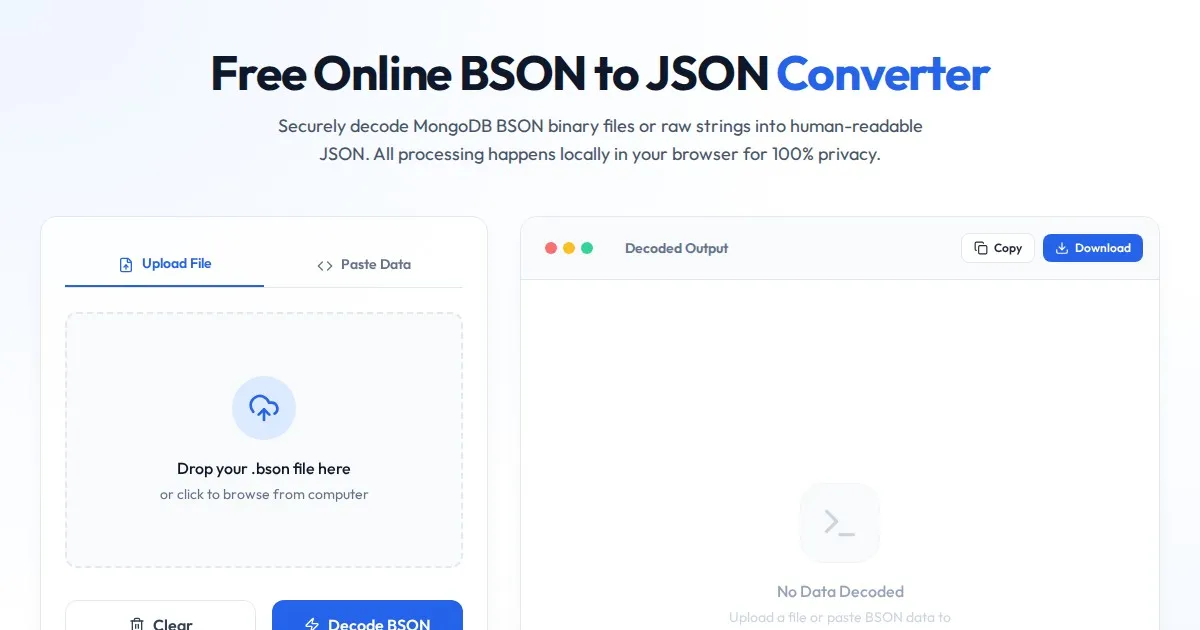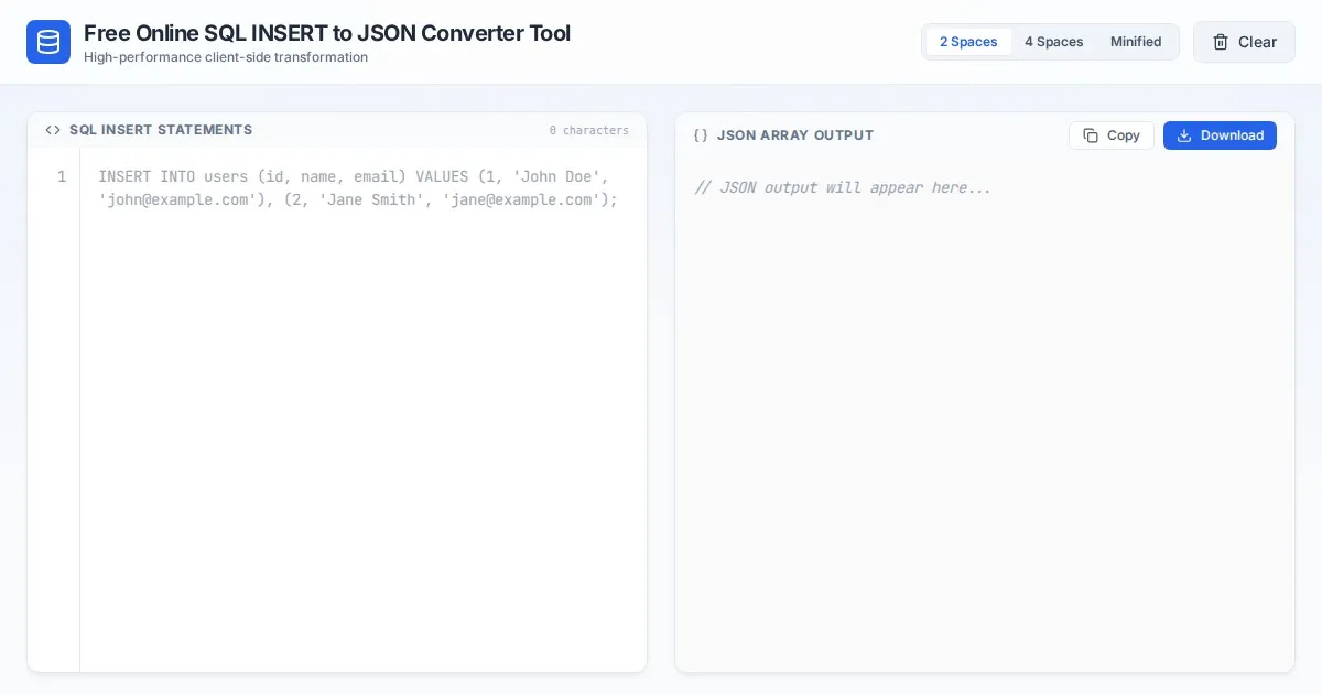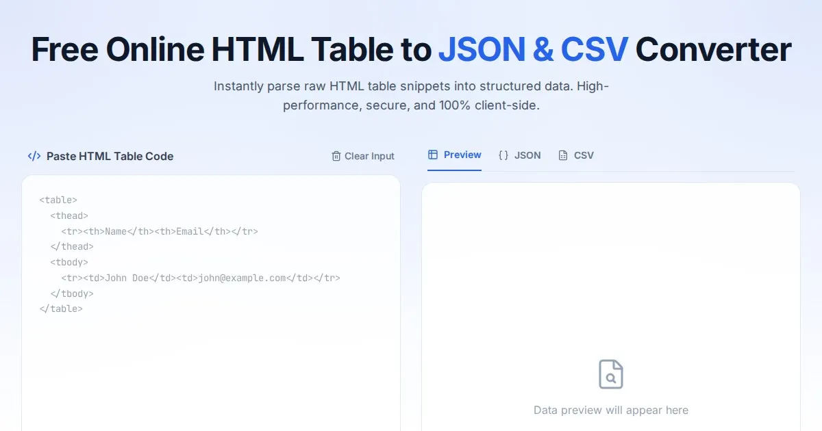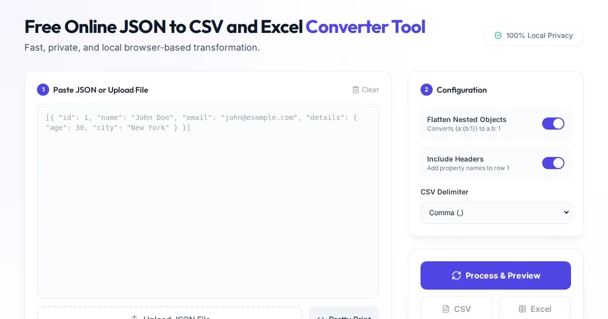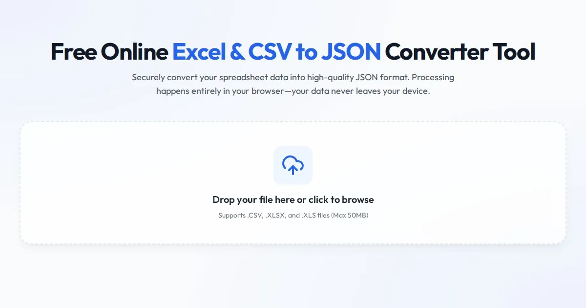 Convert Excel (.xlsx) and CSV files to clean JSON format instantly. A secure, free, client-side tool. Your data never leaves your browser. Fast and reliable.