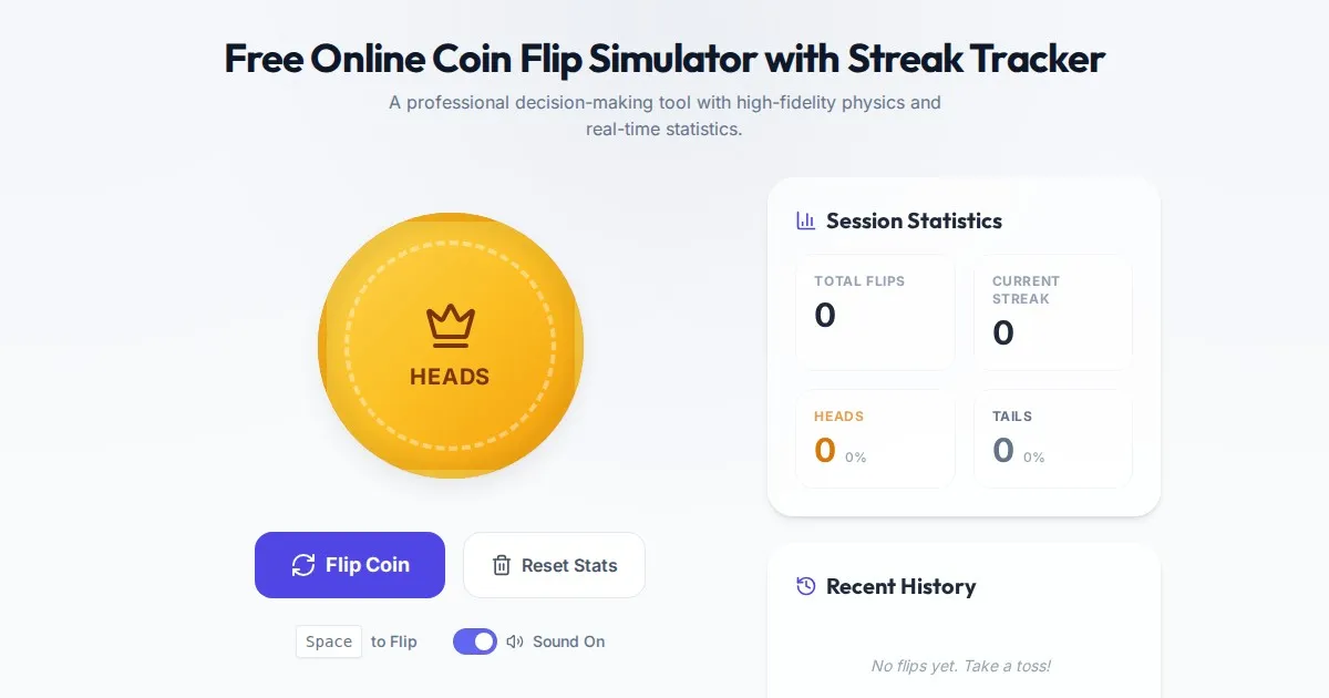 Flip a coin instantly with our free online simulator. Features realistic animations, a real-time streak counter, and flip statistics. No download required.