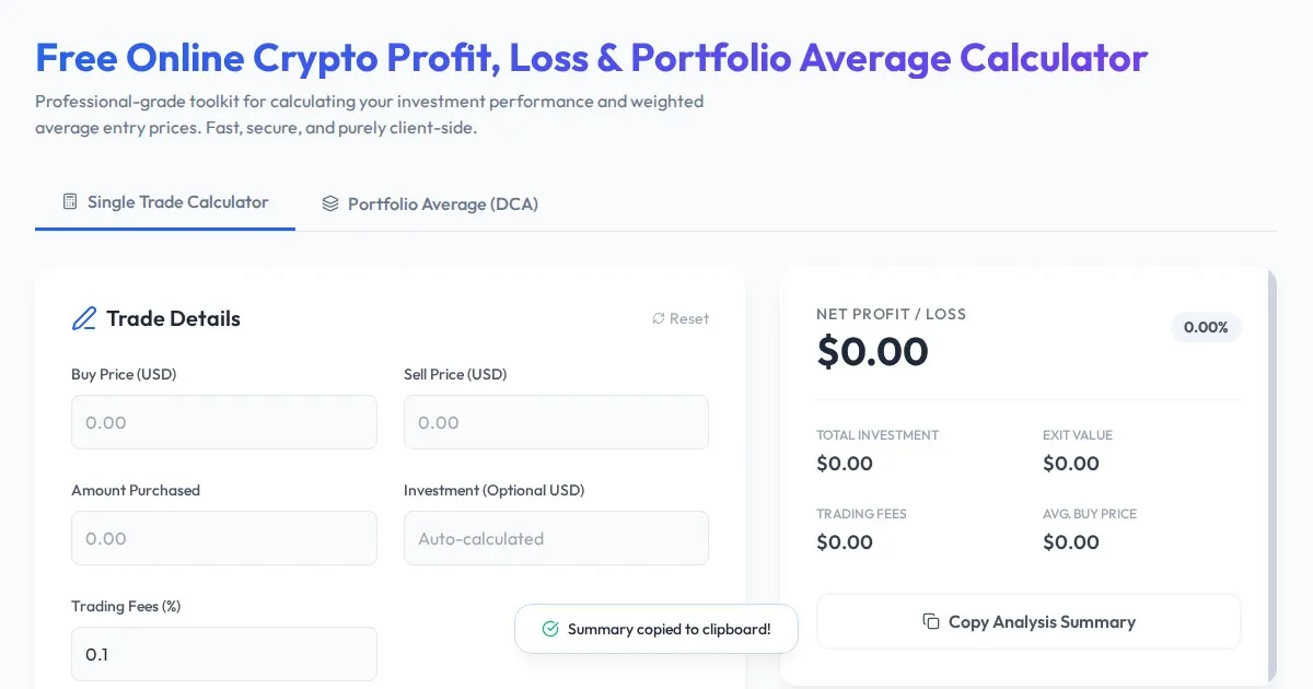Use our free, private online crypto calculator to analyze portfolio profit, loss, and dollar-cost average. No storage, no signup, just fast calculations.