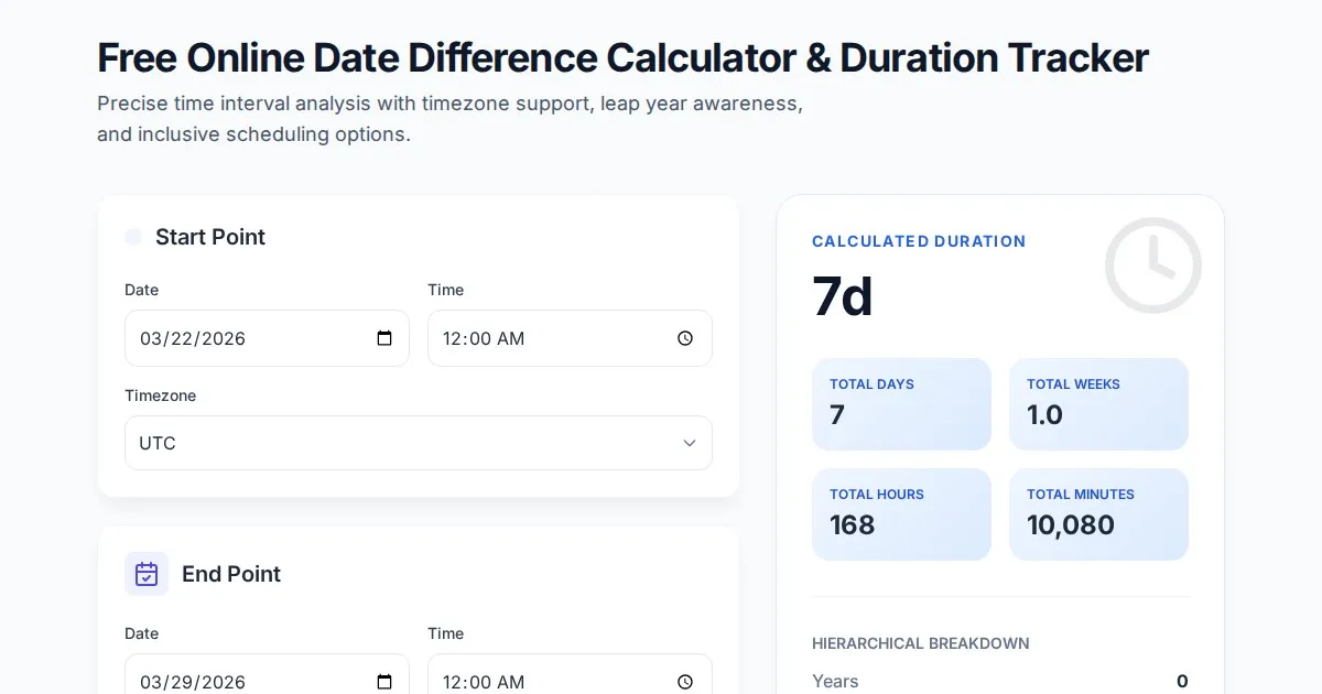 Calculate the exact time difference between two dates in days, weeks, months, and years. Free online tool supporting leap year detection and timezone accuracy.