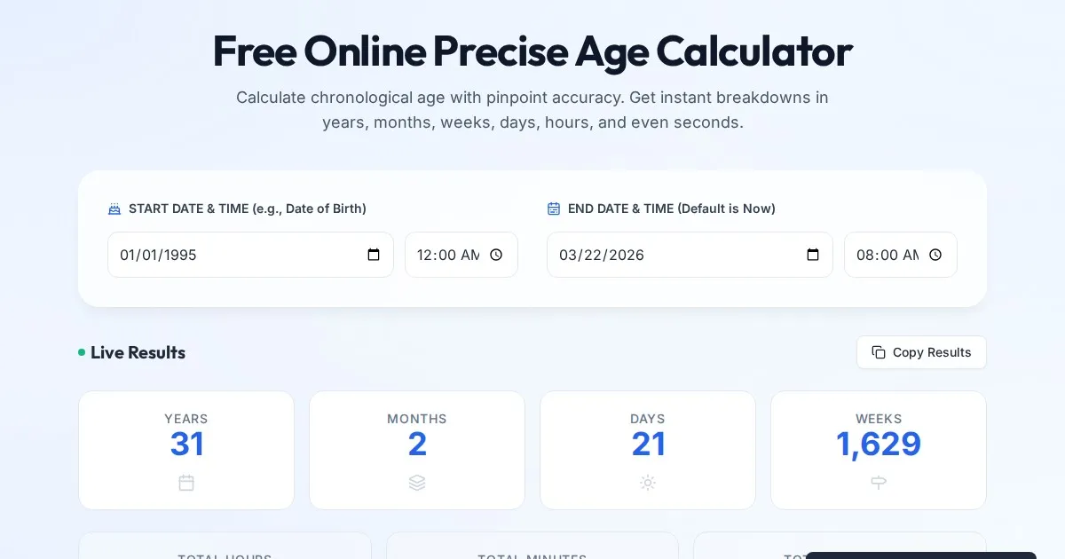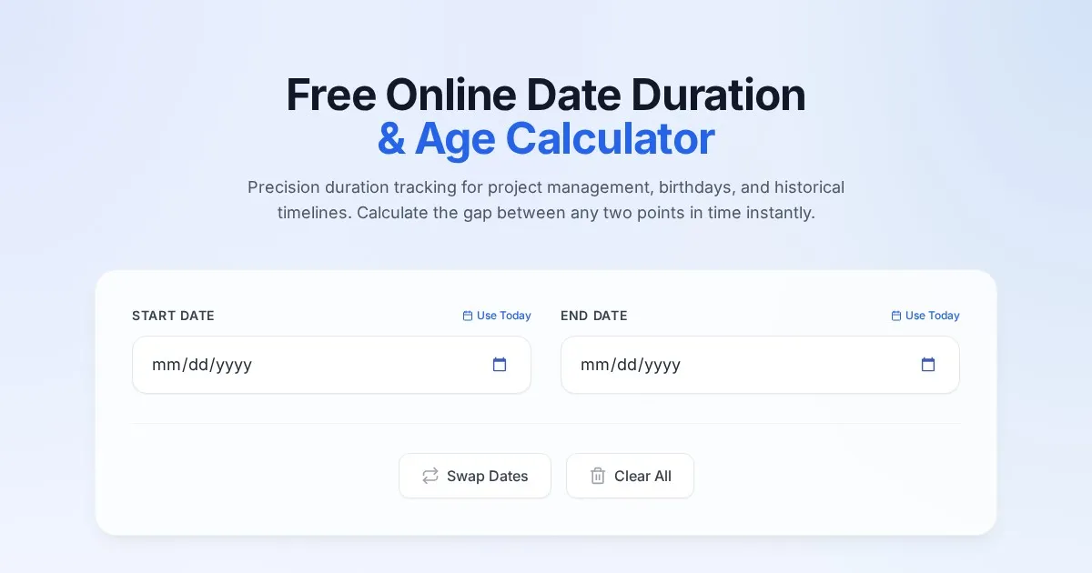 Calculate your exact age down to the second with this free online tool. Determine years, months, days, and time elapsed between any two specific dates instantly.