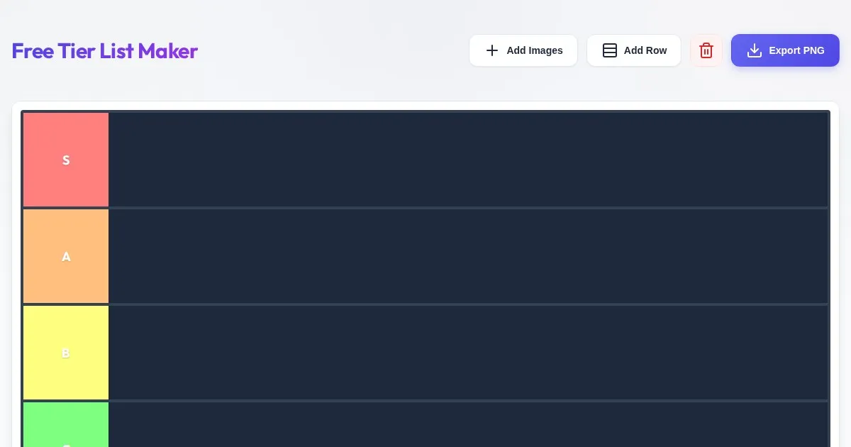 Create custom tier lists online for free. Easily drag and drop images to rank items, customize tier labels, and export your completed tier list as a high-quality PNG image file directly in your browser.