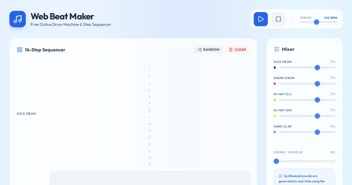 Compose beats in your browser with our free online drum machine and step sequencer. Easy-to-use rhythm creator for music producers. No plugins required.