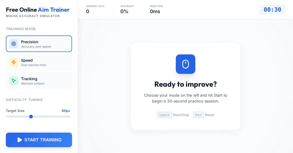Improve your mouse precision and reaction speed with this free online FPS aim trainer. A browser-based practice tool for gaming accuracy, no download required.