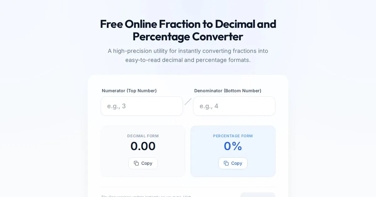 Convert fractions to decimals and percentages instantly with our free, high-precision online calculator. Simple, fast, and perfect for math and engineering needs.