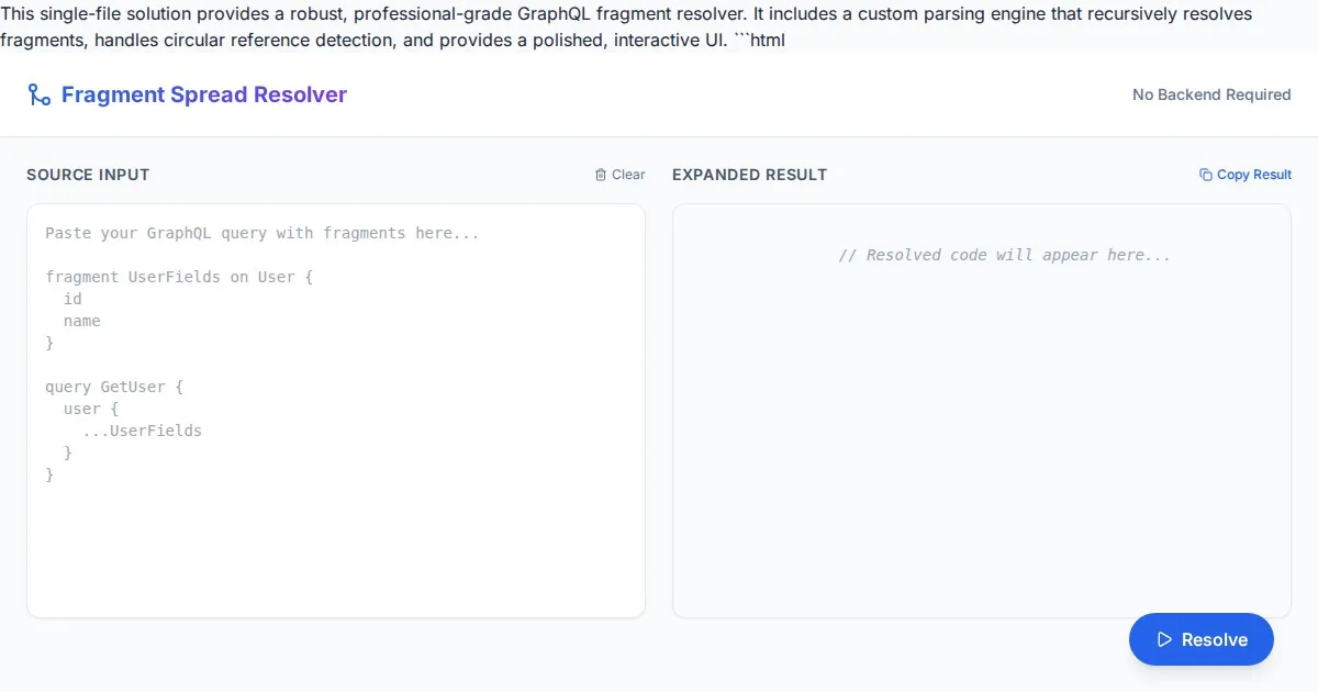 Instantly expand complex GraphQL fragment spreads into full selection sets. Use our free, browser-based tool to flatten nested fragments for easier debugging.