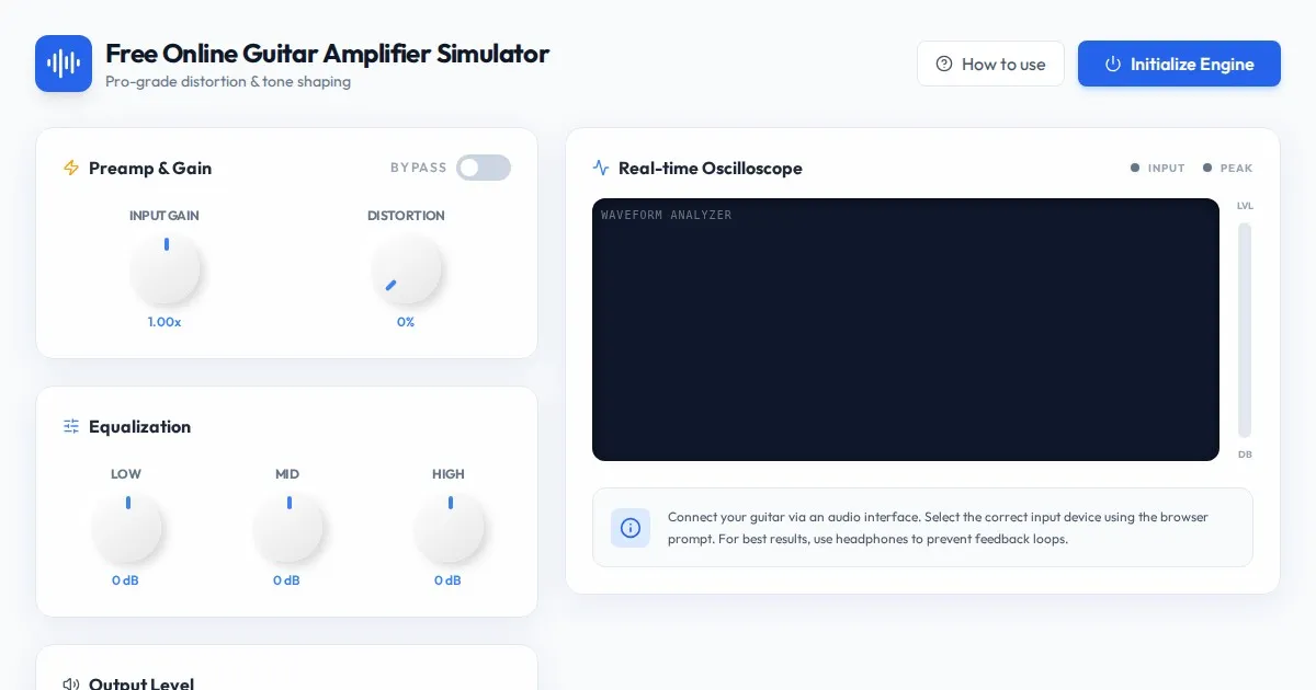 Experience realistic guitar tones with this free online guitar amplifier simulator. Adjust gain, drive, and EQ settings instantly in your browser. No installation.