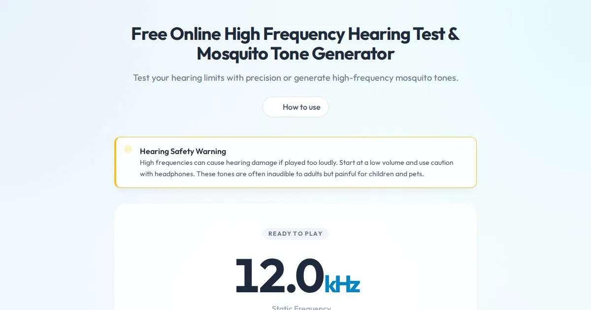 Test your high-frequency hearing range with this free online tool. Generate precise mosquito tones from 8kHz to 22kHz in your browser. No registration required.