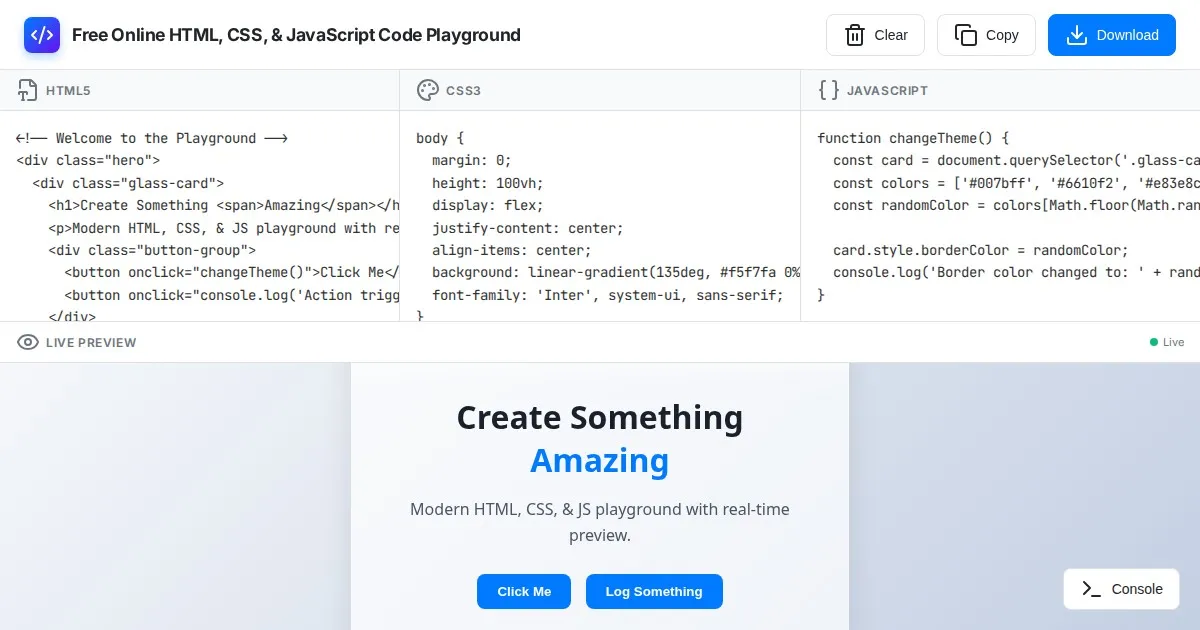 Practice front-end web development with this free online HTML, CSS, and JavaScript code playground. Edit, preview, and test code in real-time effortlessly.
