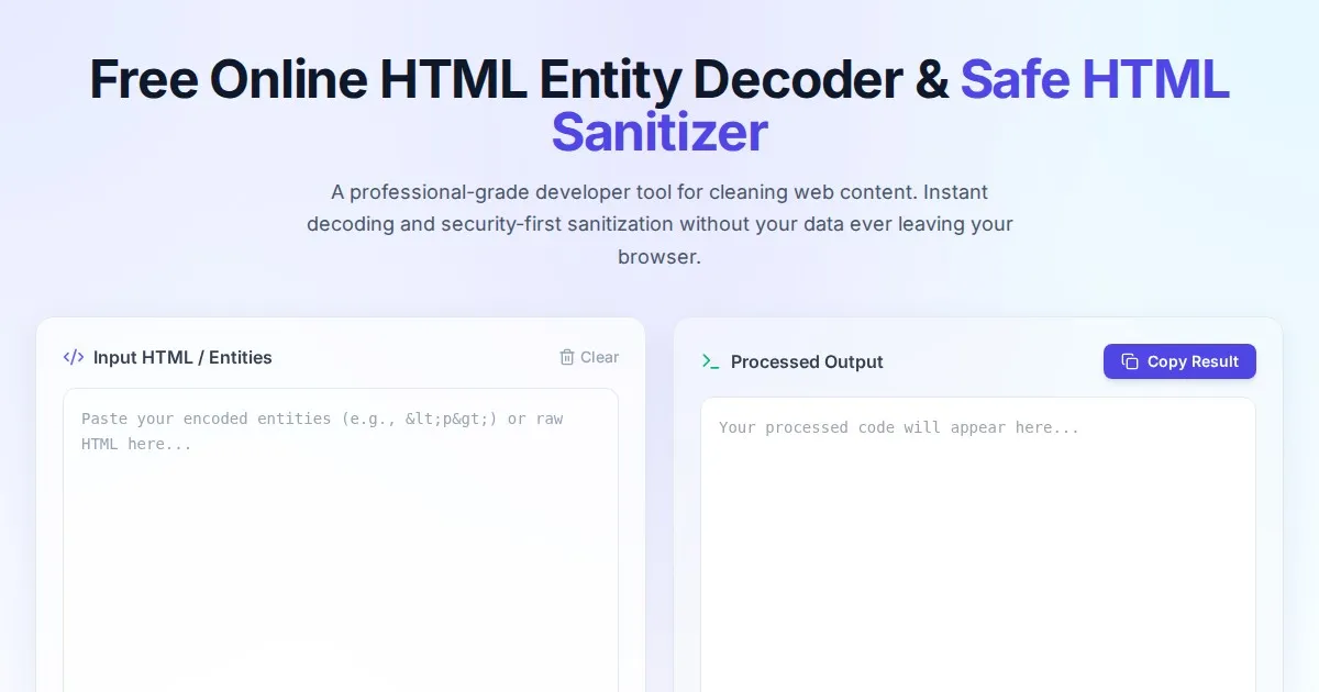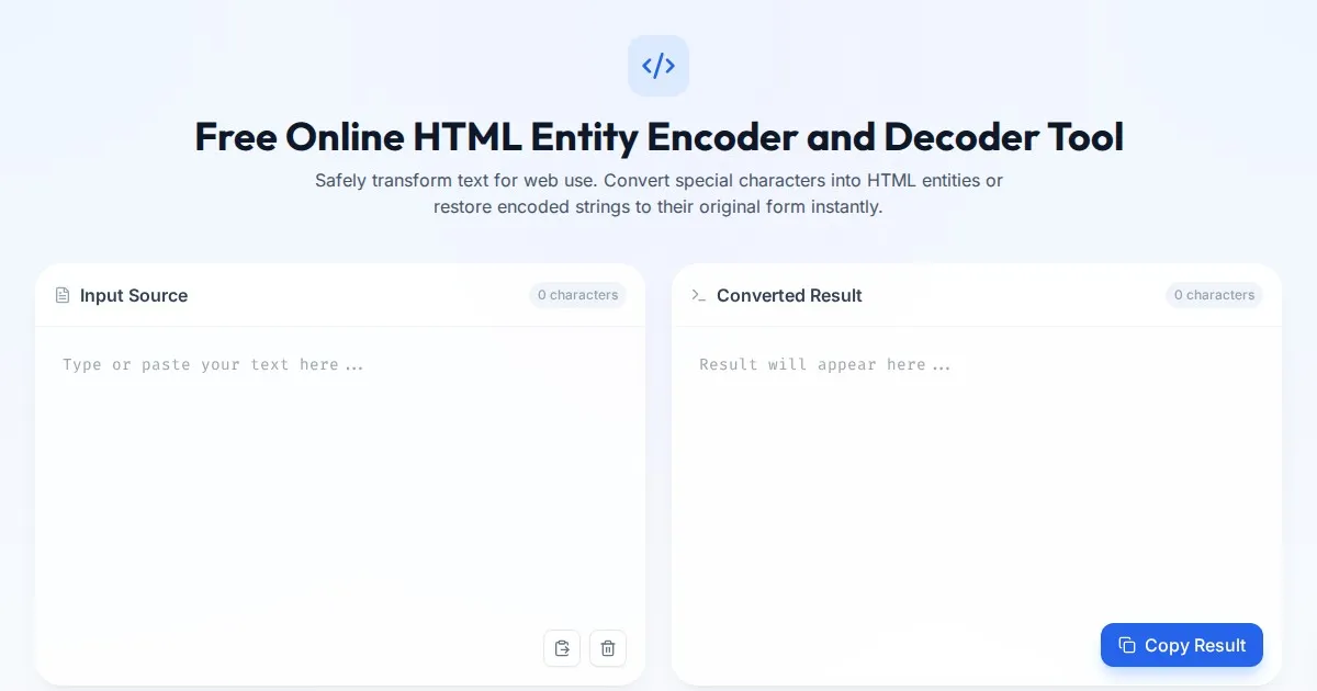 Instantly encode and decode HTML entities with this free online tool. Perfect for developers to convert special characters for safe web display and rendering.