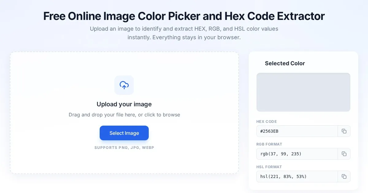 Easily extract color codes from images with our free online color picker. Get instant Hex, RGB, and HSL values by clicking any pixel. No file upload needed.