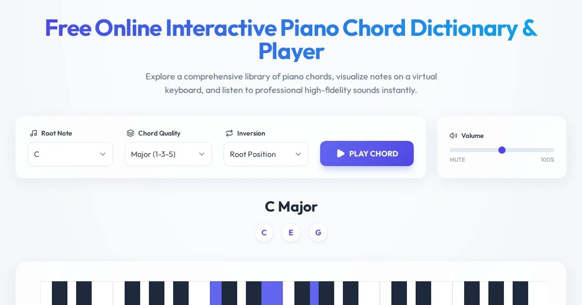 Access a free online interactive piano chord dictionary. Instantly generate, visualize, and play hundreds of major, minor, and advanced piano chords.