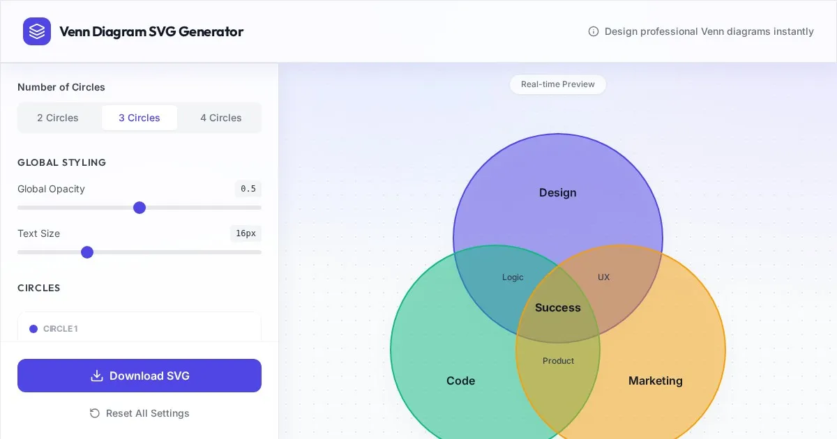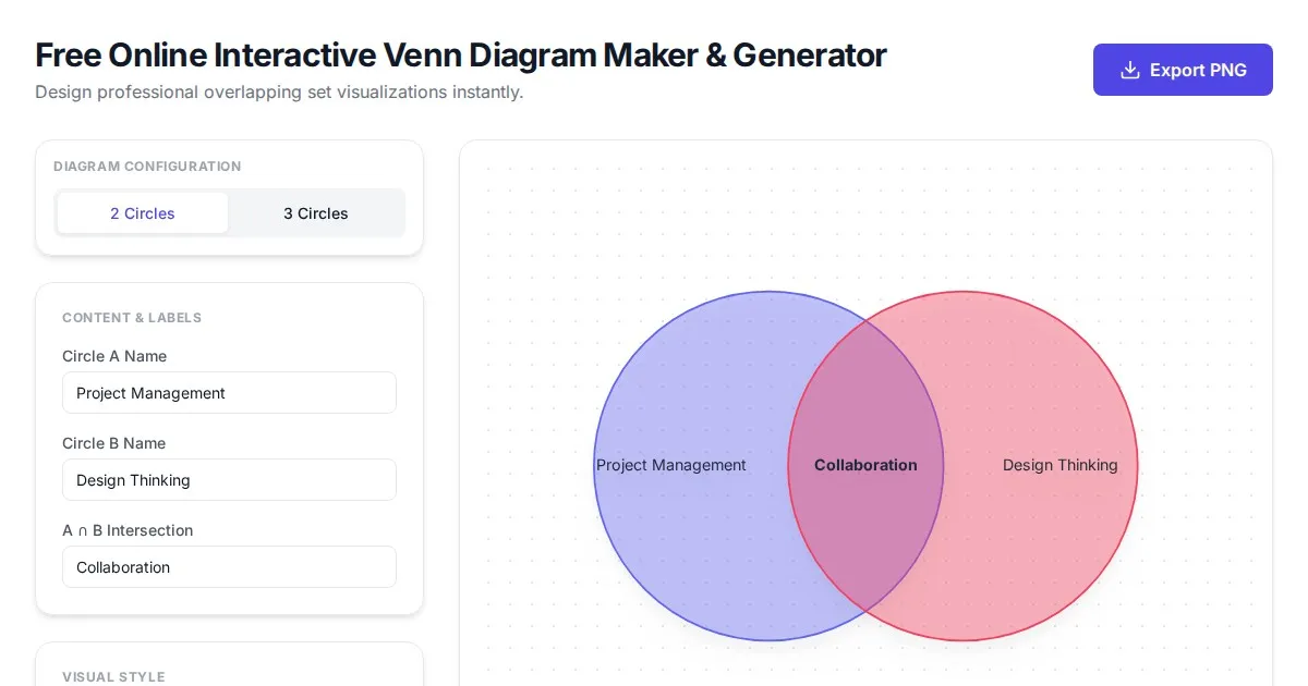 Easily create and customize 2 or 3-circle Venn diagrams online. Use this free, browser-based tool to visualize sets, intersection data, and overlapping concepts.