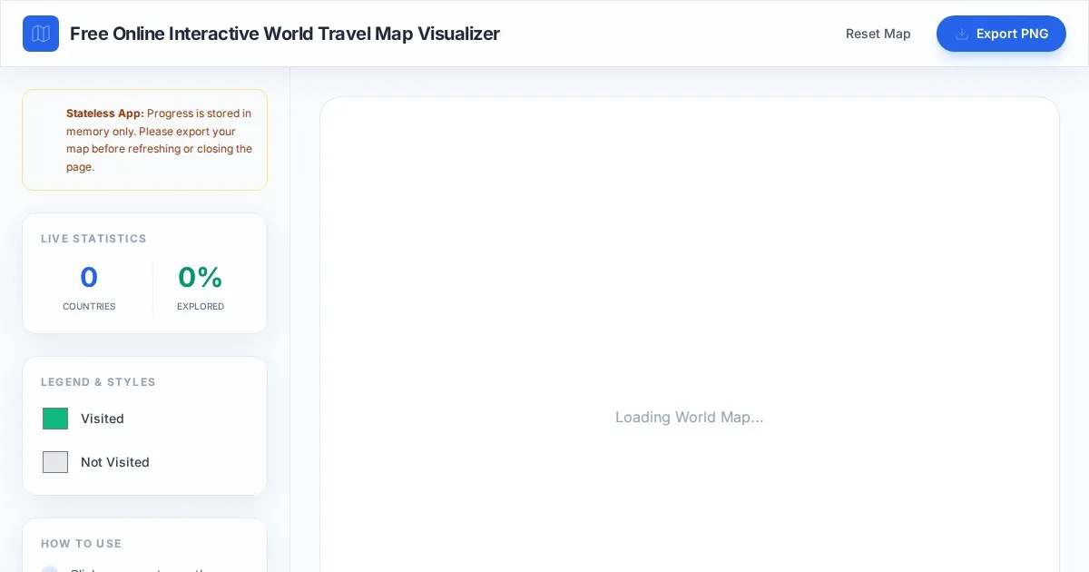Easily track, color-code, and visualize your visited countries with this free, interactive world map generator. Create custom travel maps instantly online.