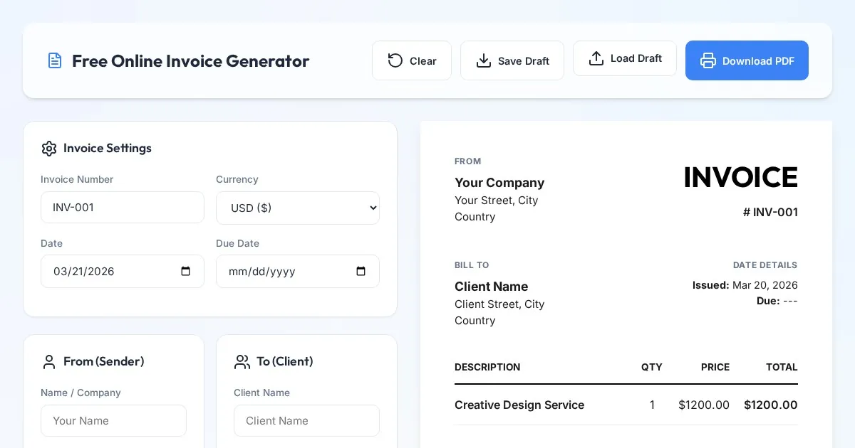 Create professional invoices for free with this online generator. Save, edit, and download PDFs directly in your browser. No sign-up, no upload, 100% private.