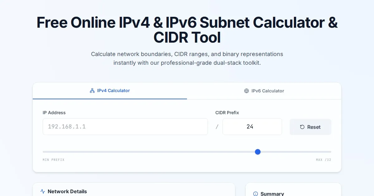 Calculate IPv4 and IPv6 subnets, CIDR blocks, network masks, and broadcast addresses instantly with this free online networking calculator. No registration needed.