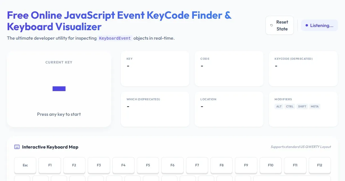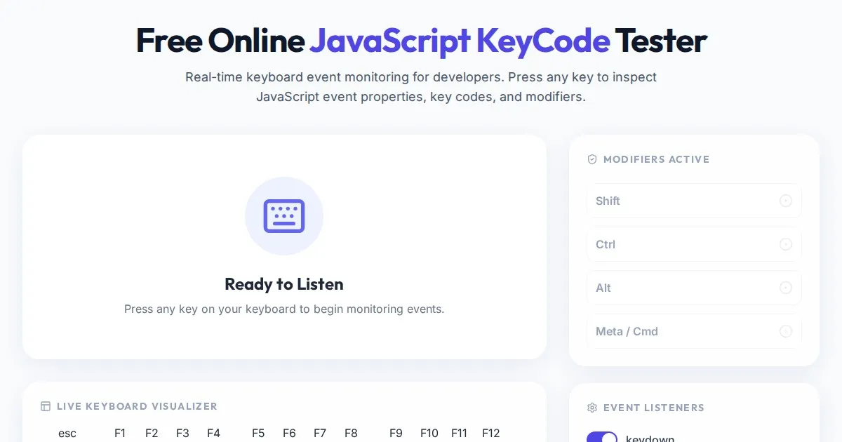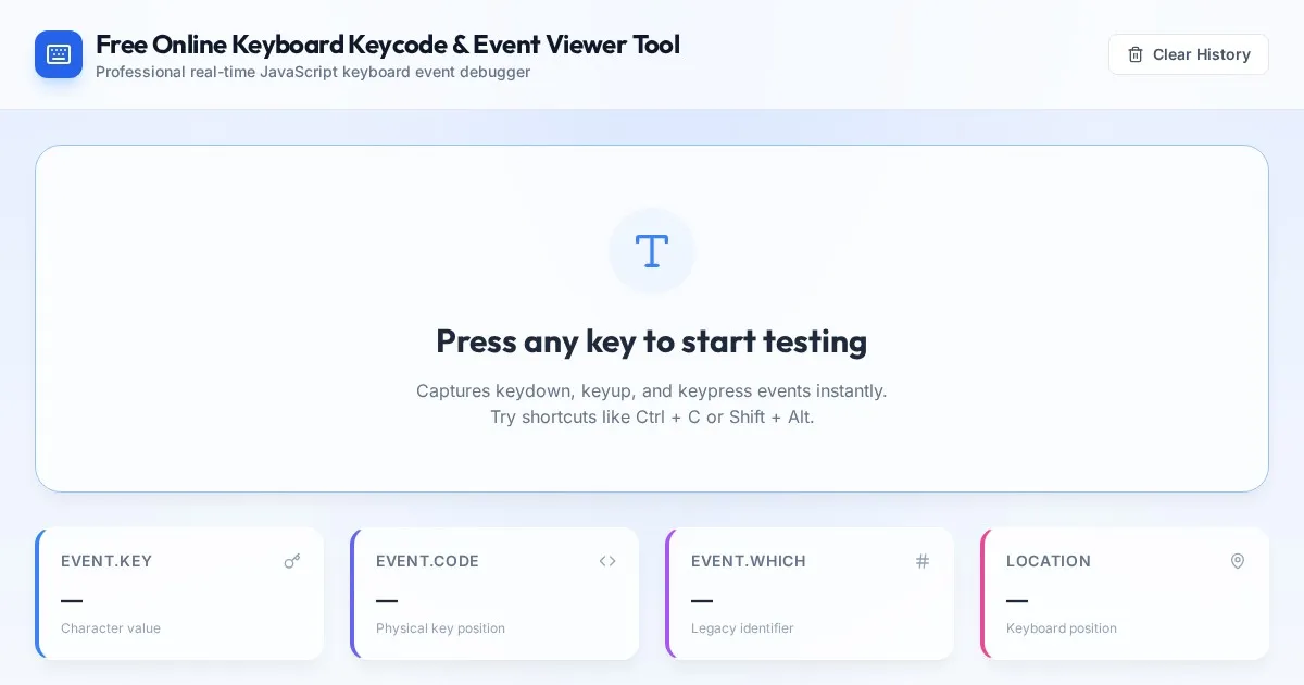 Instantly inspect keyboard events with this free online tool. View JavaScript keycode, event code, key value, location, and modifier states in real-time.