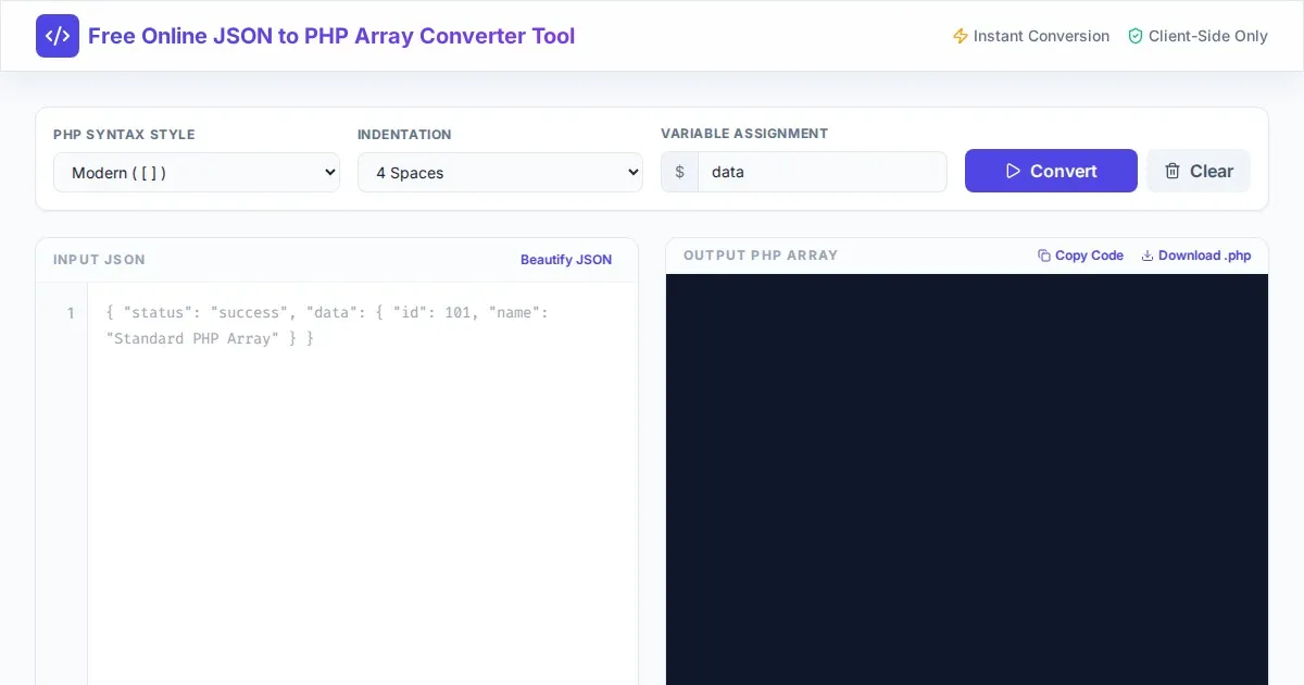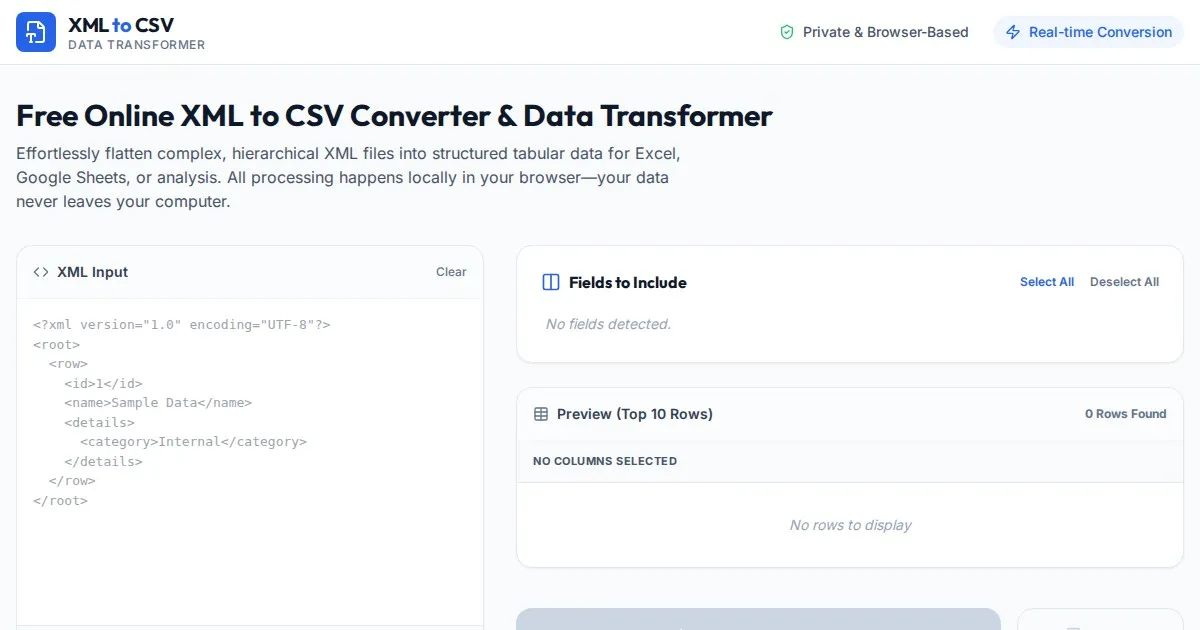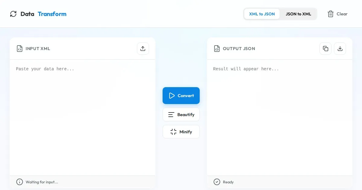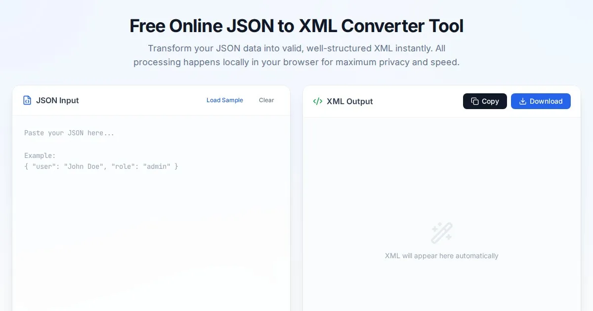 Convert XML to JSON or JSON to XML instantly with this free online tool. Fast, secure, client-side data conversion for developers. No server upload required.