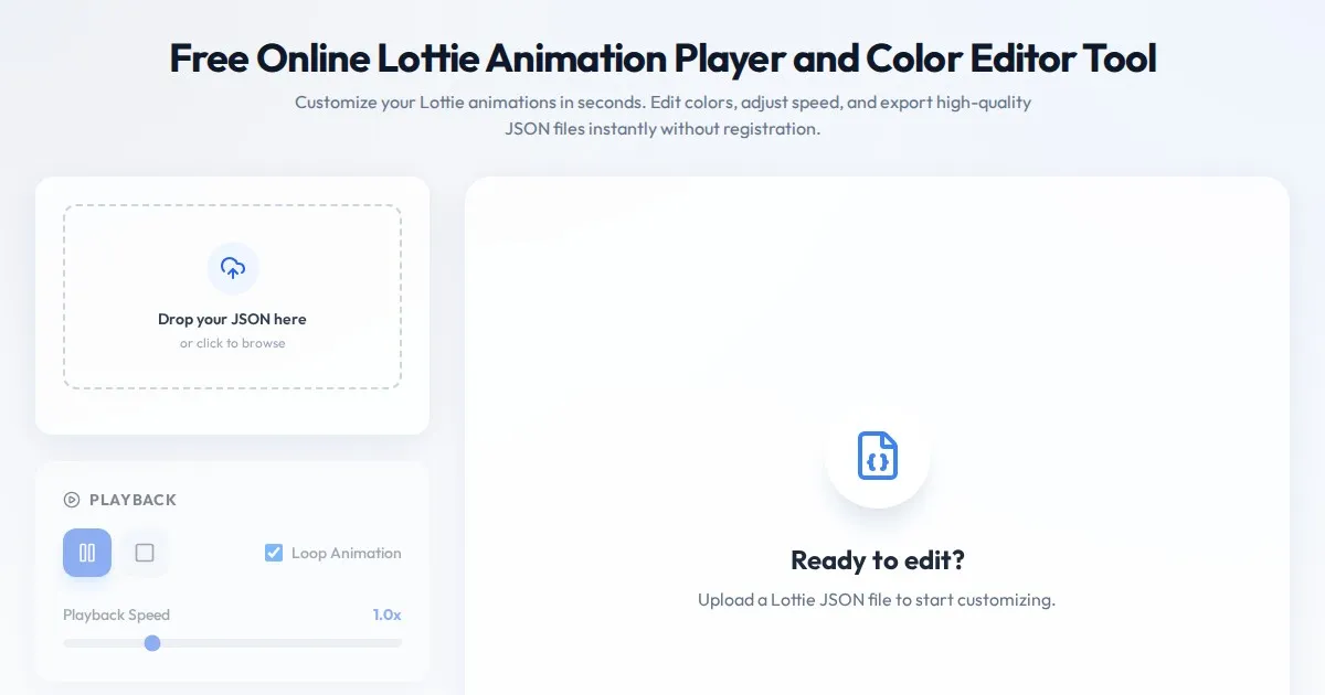 Easily preview, modify, and customize Lottie JSON animations. Change colors, adjust speed, and export your edited animation files directly in your web browser.