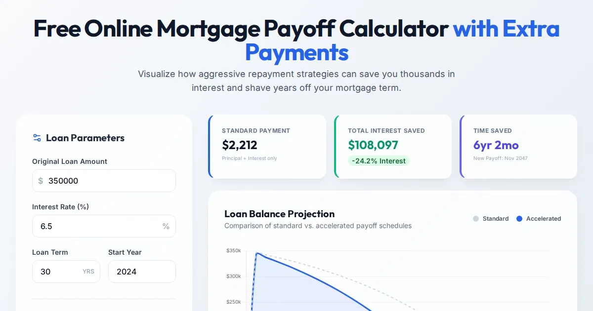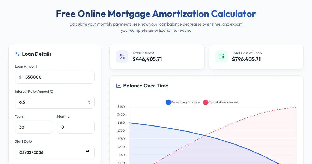 Calculate your mortgage payments, interest, and principal breakdown with our free online mortgage amortization calculator. Visualize loan progress with interactive charts.