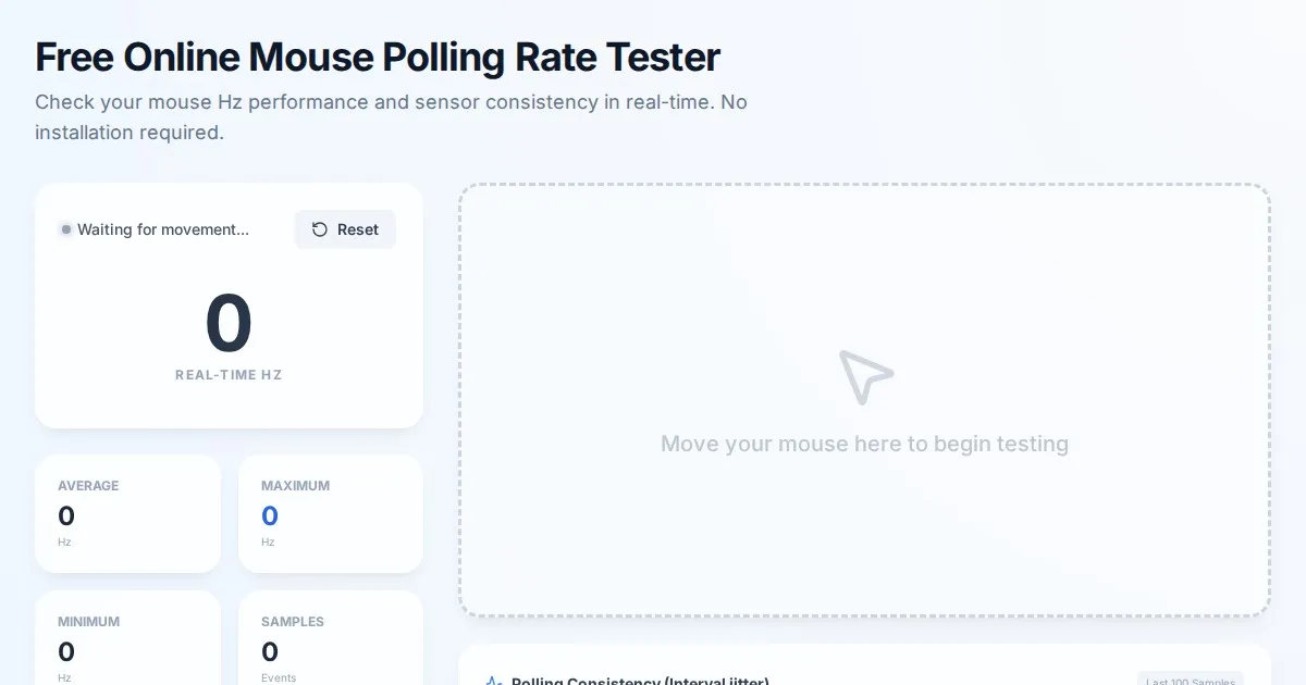 Measure your mouse polling rate in real-time with our free online tool. Check your gaming mouse performance, stability, and Hz consistency instantly without installation.
