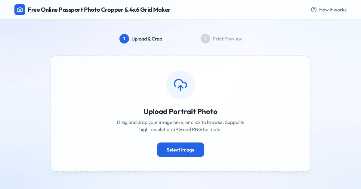 Easily crop photos to official passport dimensions and arrange them into a 4x6 print grid. Secure, browser-based tool. No uploads or registration required.